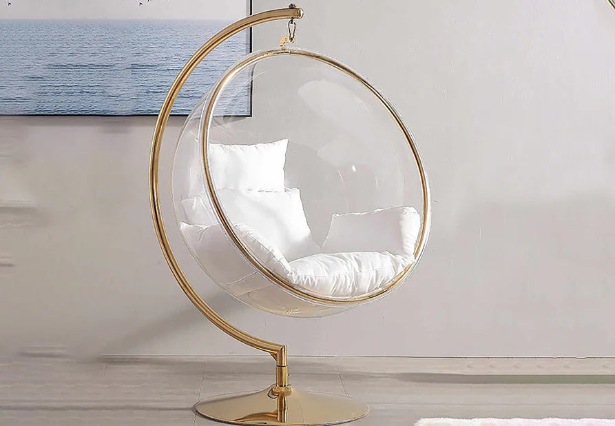 Elevate your living space with this chic and futuristic clear bubble chair. Featuring a transparent acrylic sphere suspended from a sleek golden frame, this design creates...