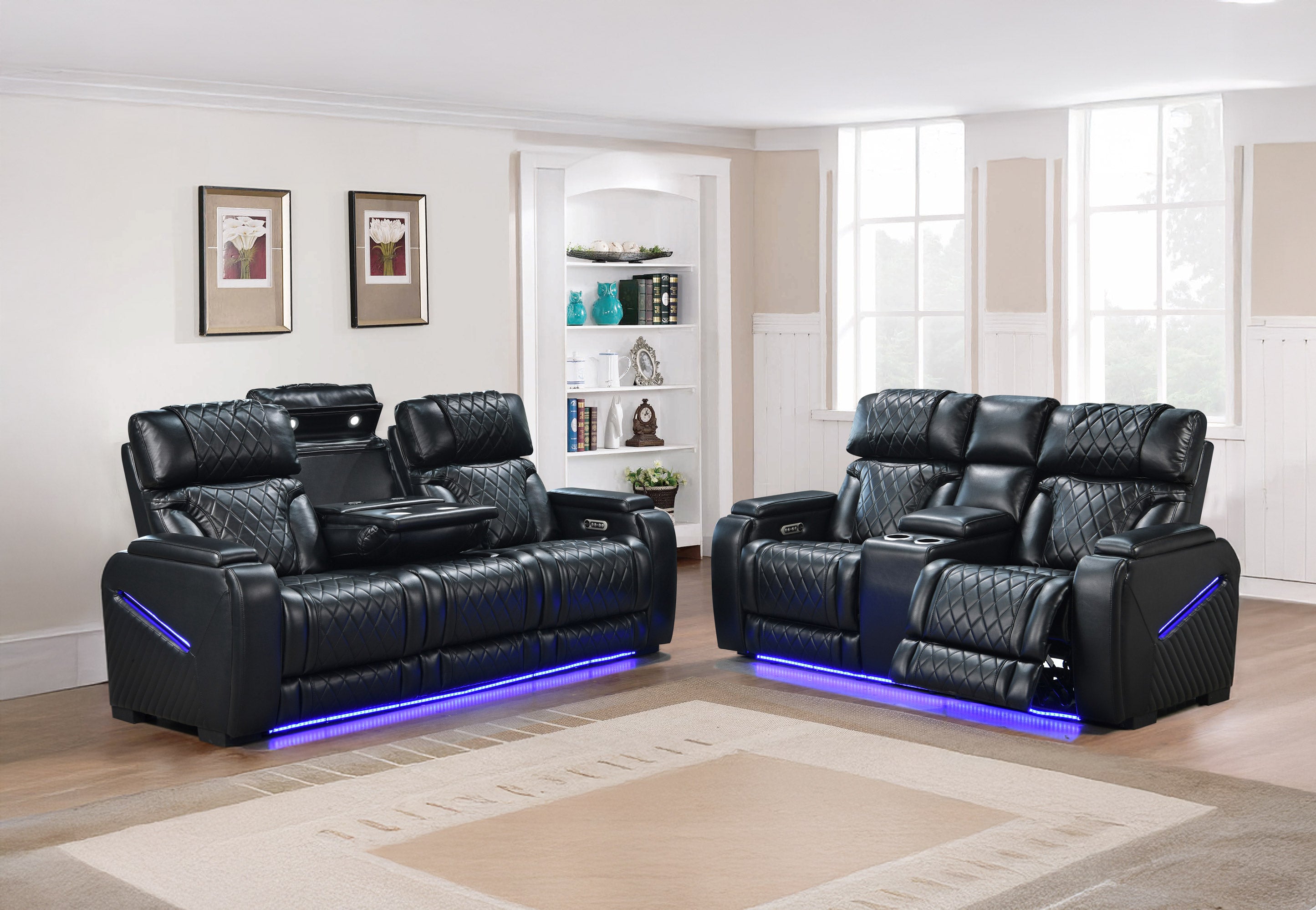 Modern black leather reclining sofa set with diamond-quilted design, built-in LED lighting, cup holders, and storage consoles. Perfect for stylish comfort and home entertainment.