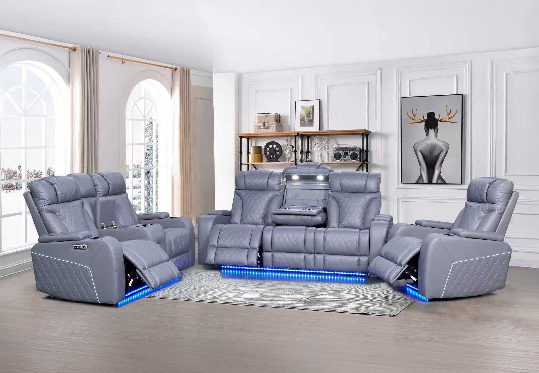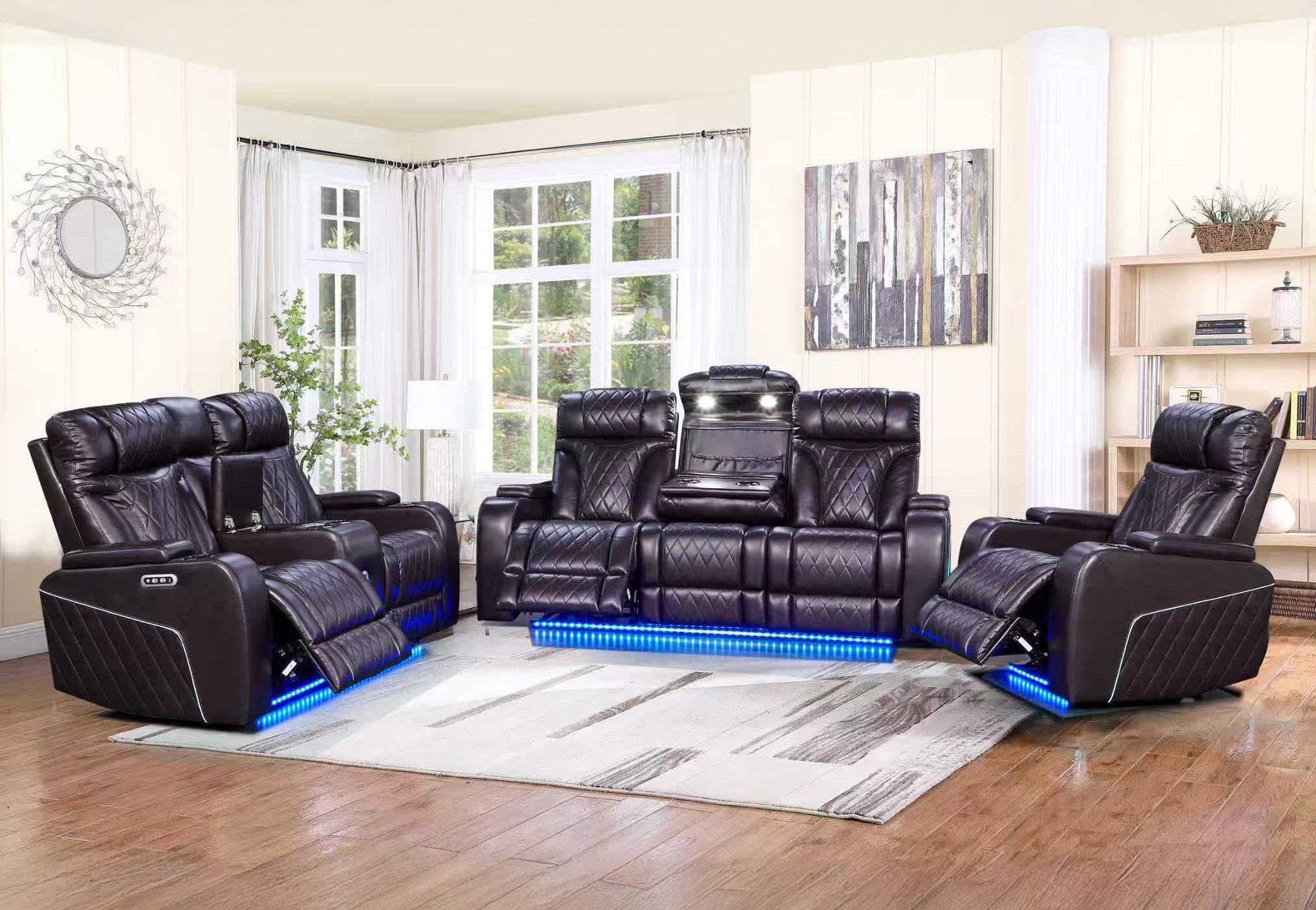 ChatGPT said: Luxurious dual reclining theater sofas in black diamond-stitched leather, featuring LED base lighting, built-in cup holders, and power controls — perfect for a modern...