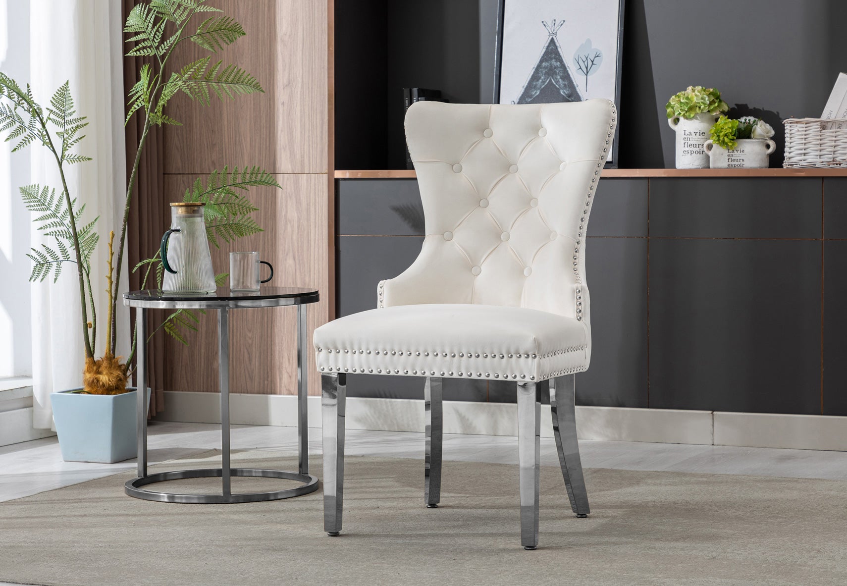 This elegant tufted dining chair combines luxurious comfort with modern sophistication. Featuring plush velvet upholstery, deep button tufting, and silver nailhead trim, it rests on polished...