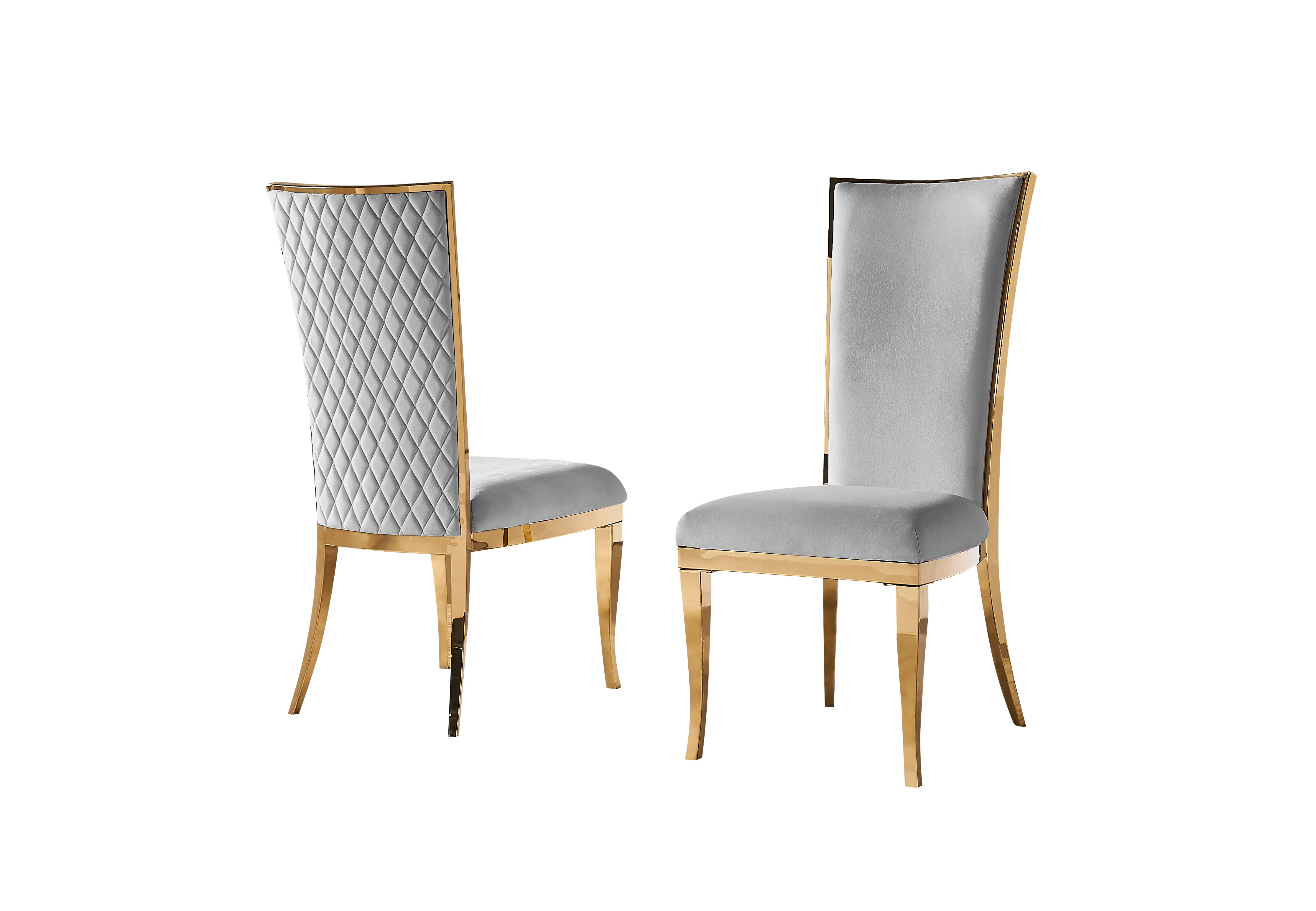 These exquisite dining chairs feature light grey velvet upholstery and a gold stainless steel frame for a blend of modern sophistication and timeless style. The quilted...