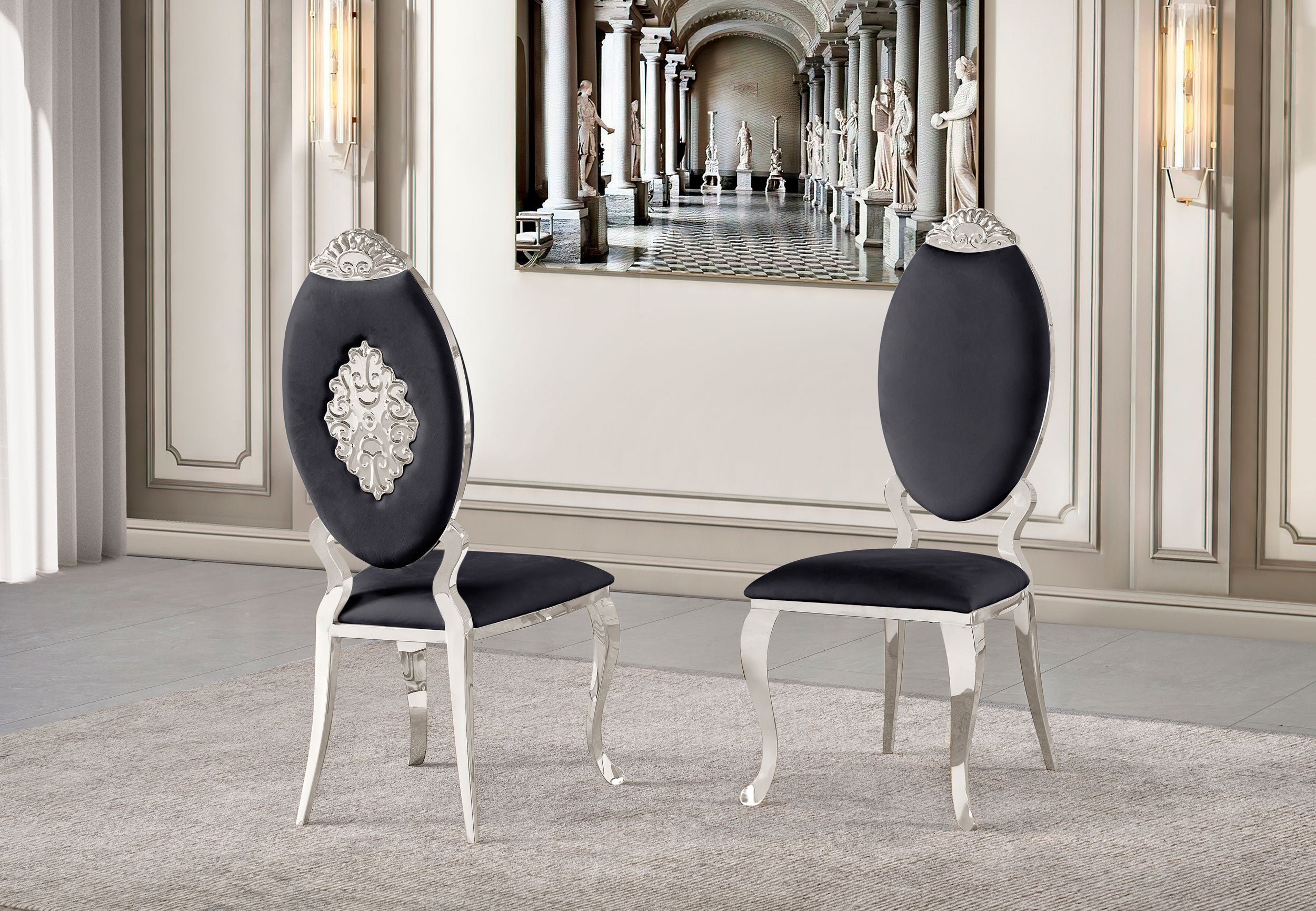 These elegant oval-back dining chairs feature luxurious black velvet upholstery paired with polished silver accents. The intricate detailing and curved silhouette make them an ideal choice...