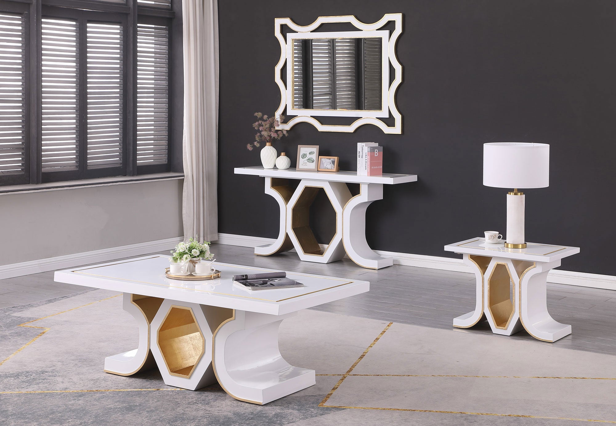 Bring elegance and cohesion to your living space with this modern furniture set featuring a coffee table, console table, side table, and matching mirror. Each piece...