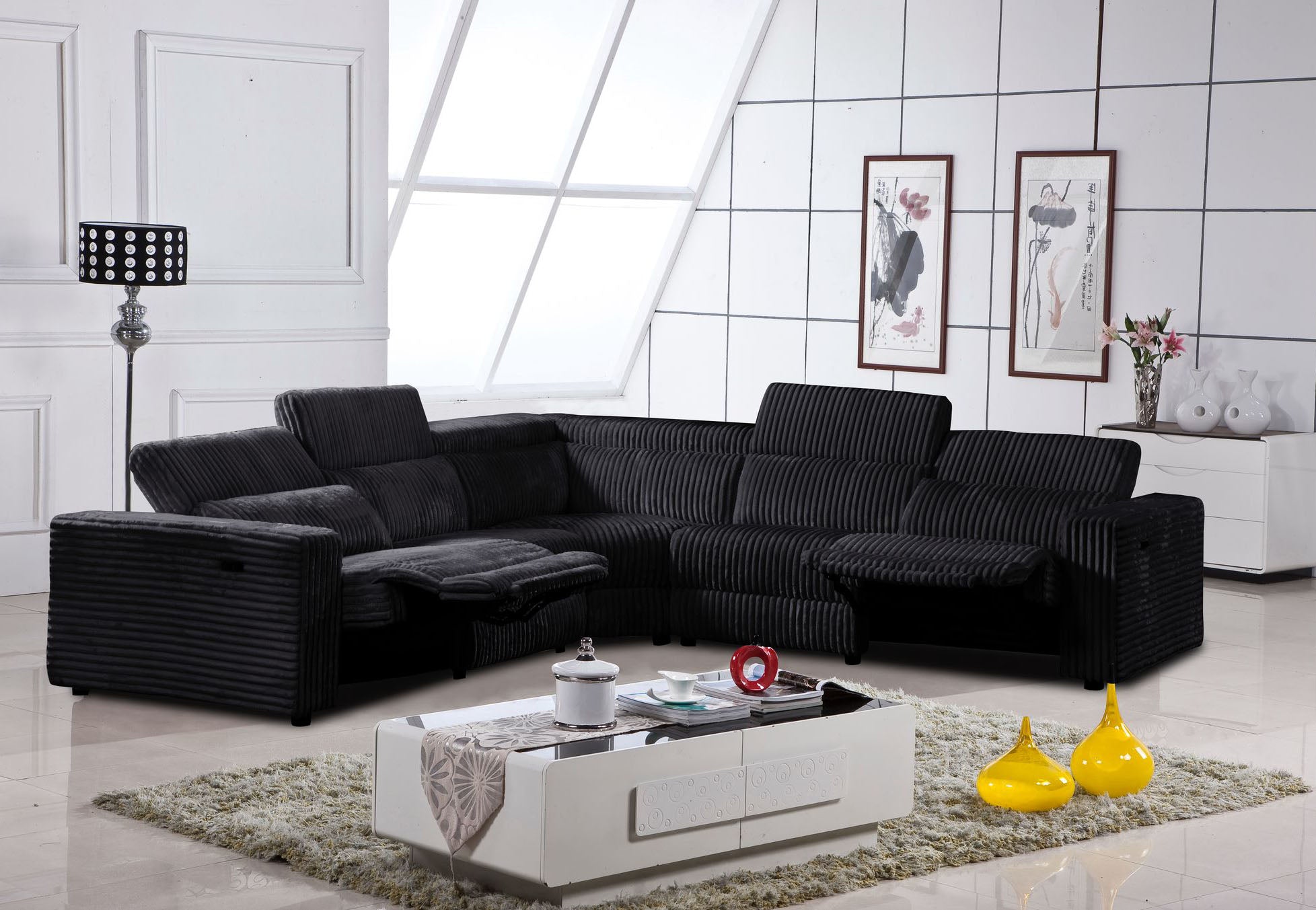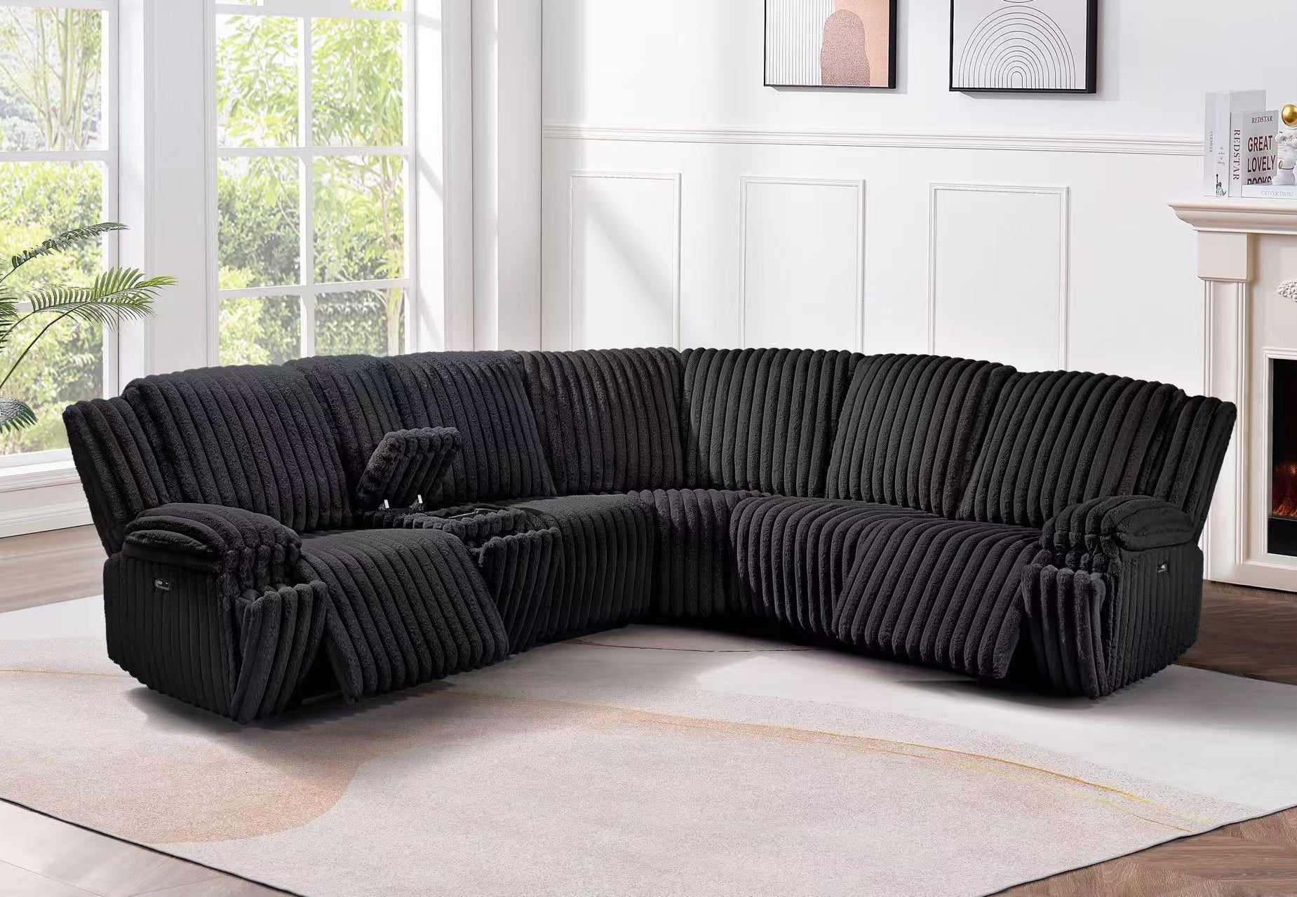 This product is a contemporary black sectional recliner sofa, designed for both style and comfort. Upholstered in plush, ribbed fabric, it features generously padded seats, backrests,...