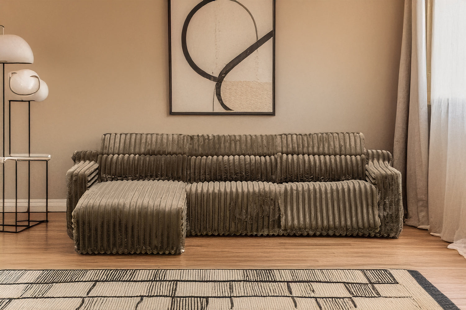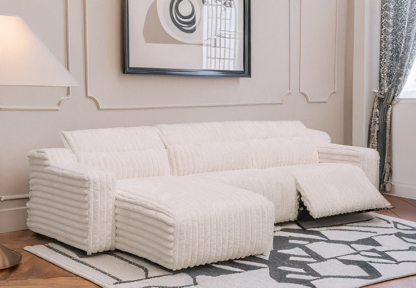 White L-shaped sectional sofa with plush, ribbed upholstery. Its soft texture and modern design make it both stylish and comfortable, perfect for a cozy, contemporary living...