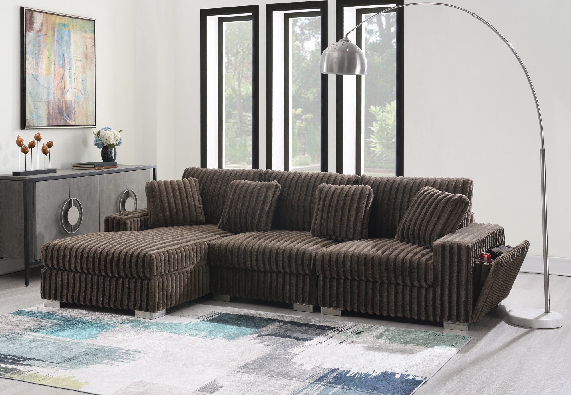 This image showcases a large, U-shaped sectional sofa with a contemporary and luxurious design. It features plush, ribbed upholstery in a deep brown color, offering a...