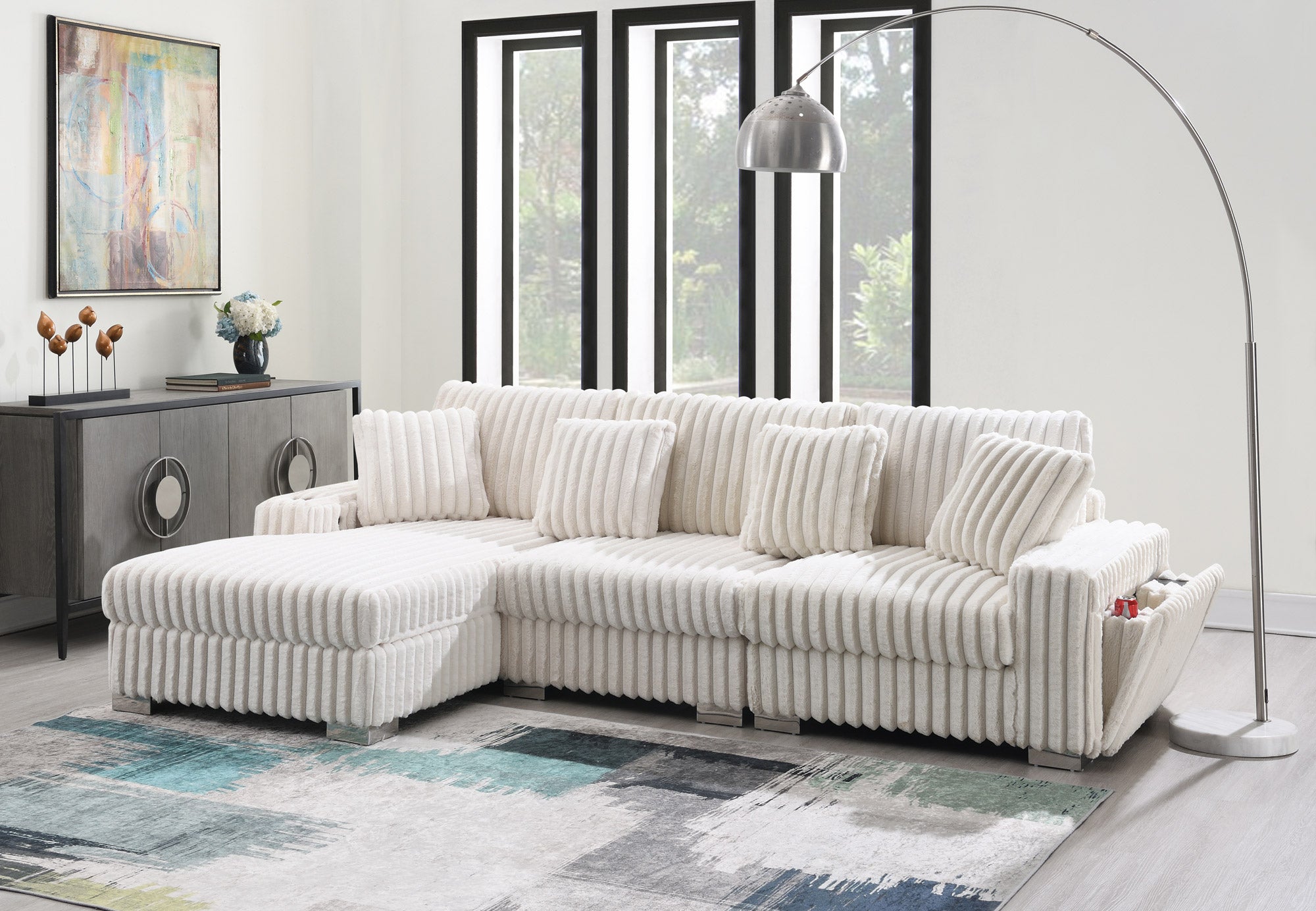 This image shows a sectional sofa with a contemporary, plush design, upholstered in a soft, creamy white fabric with ribbed texture. It has an L-shaped layout...