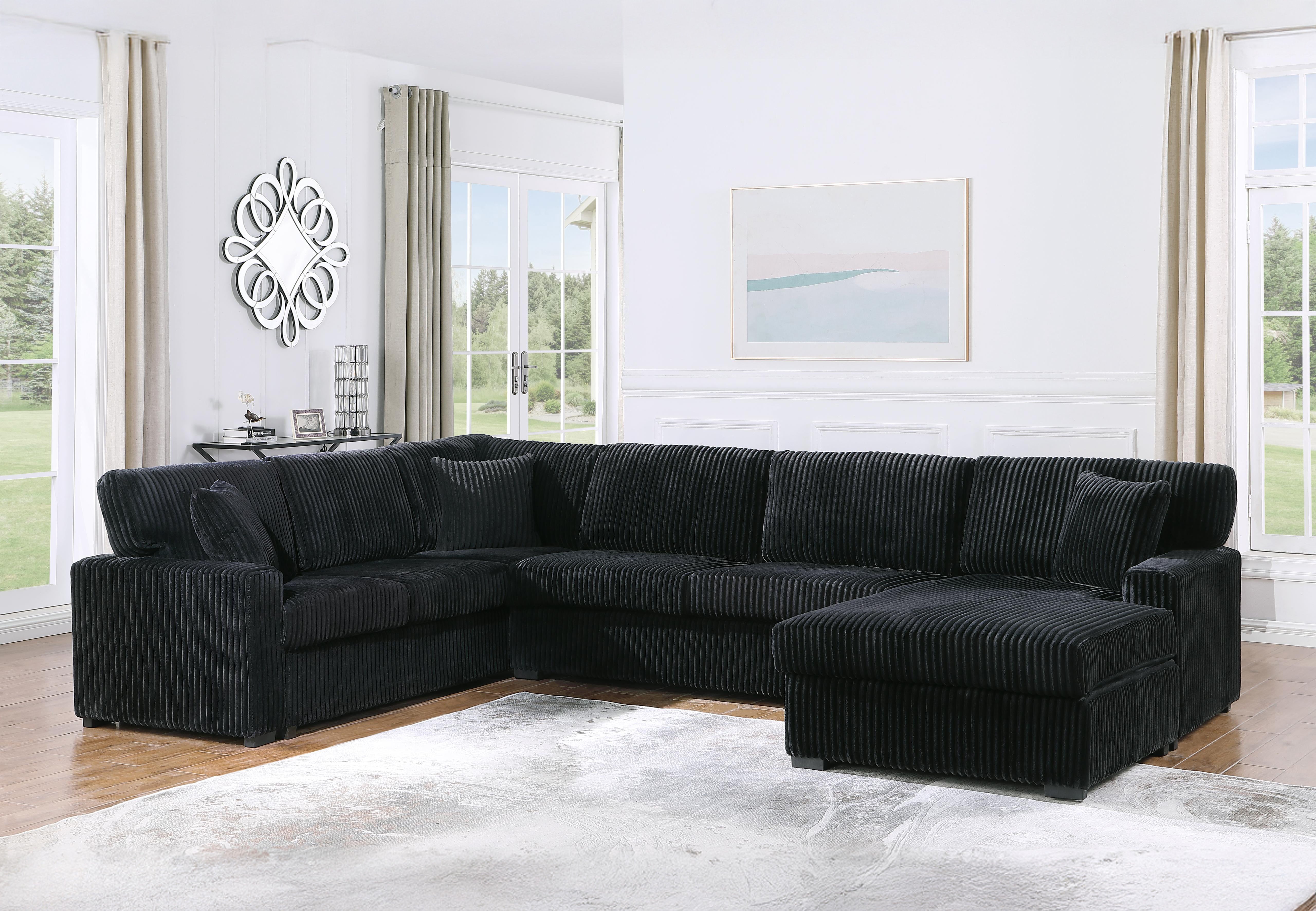 Modern black corduroy sectional sofa with a spacious L-shape design, plush cushions, and a cozy chaise lounge, perfect for contemporary living rooms. Size 141"X93"X48"