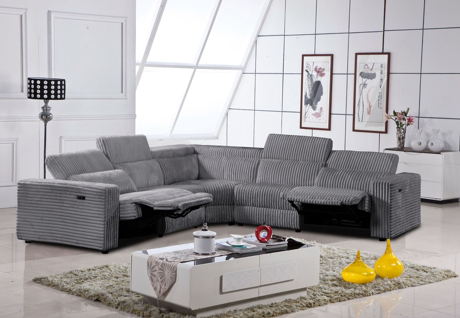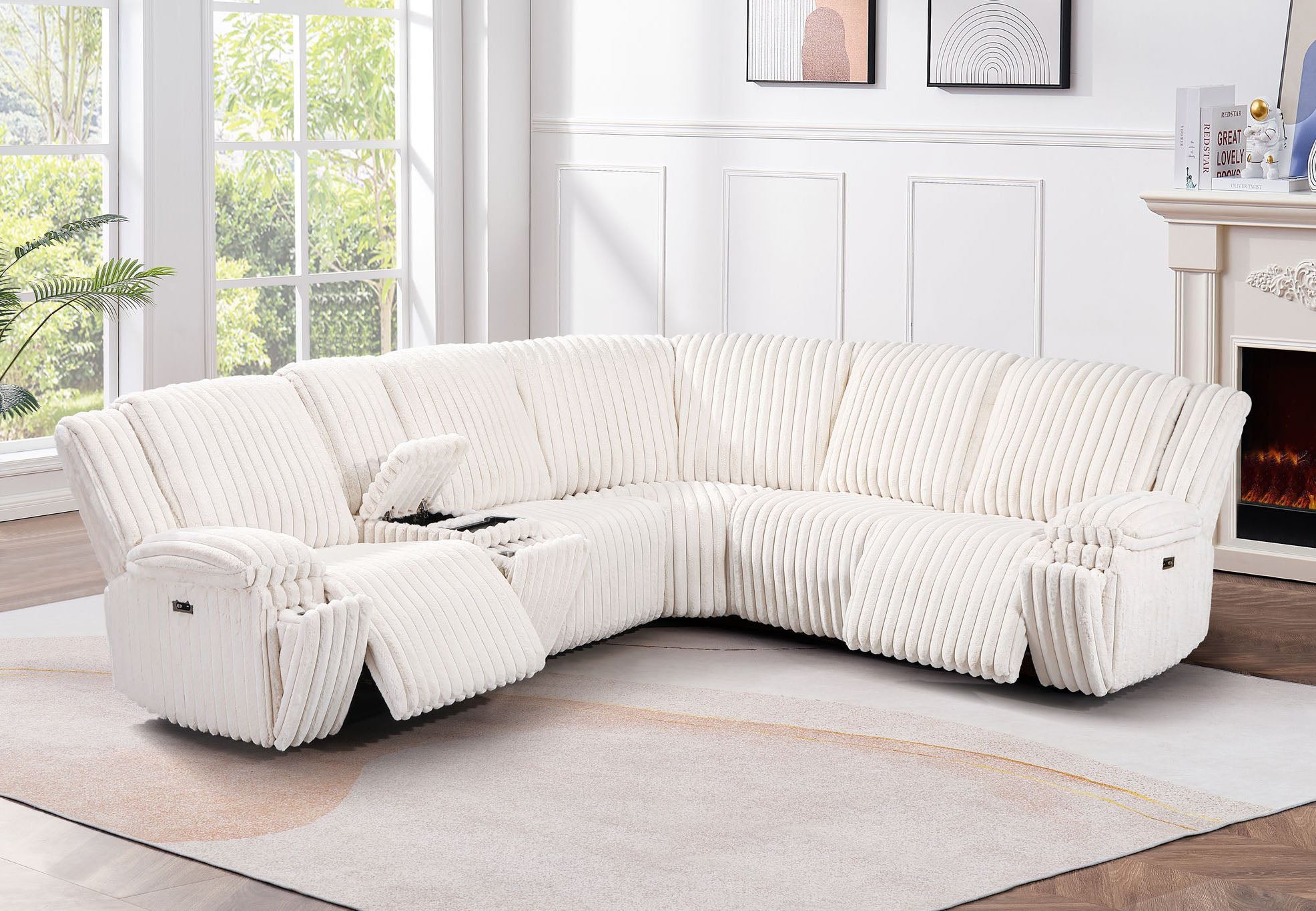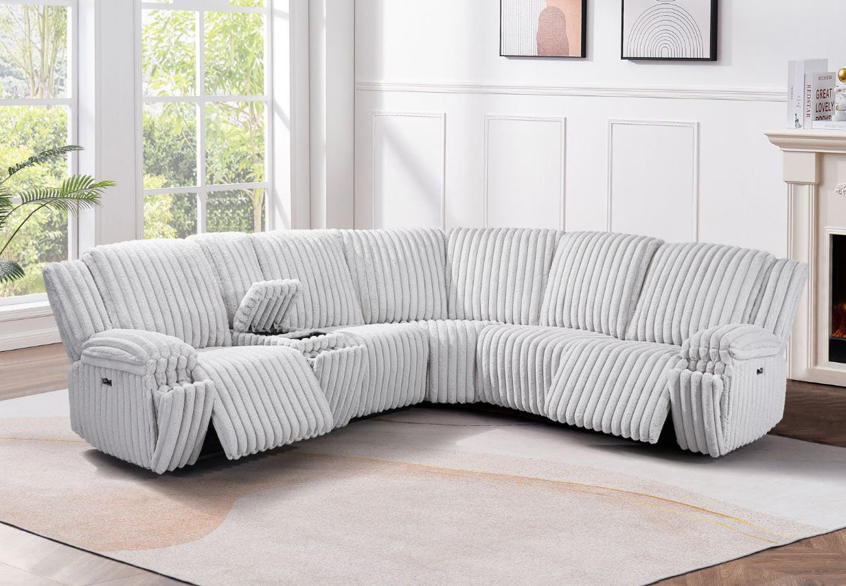 A modern, plush sectional sofa with a ribbed texture and built-in power recliners, offering a sleek and comfortable design with adjustable headrests and wide armrests. Raf...