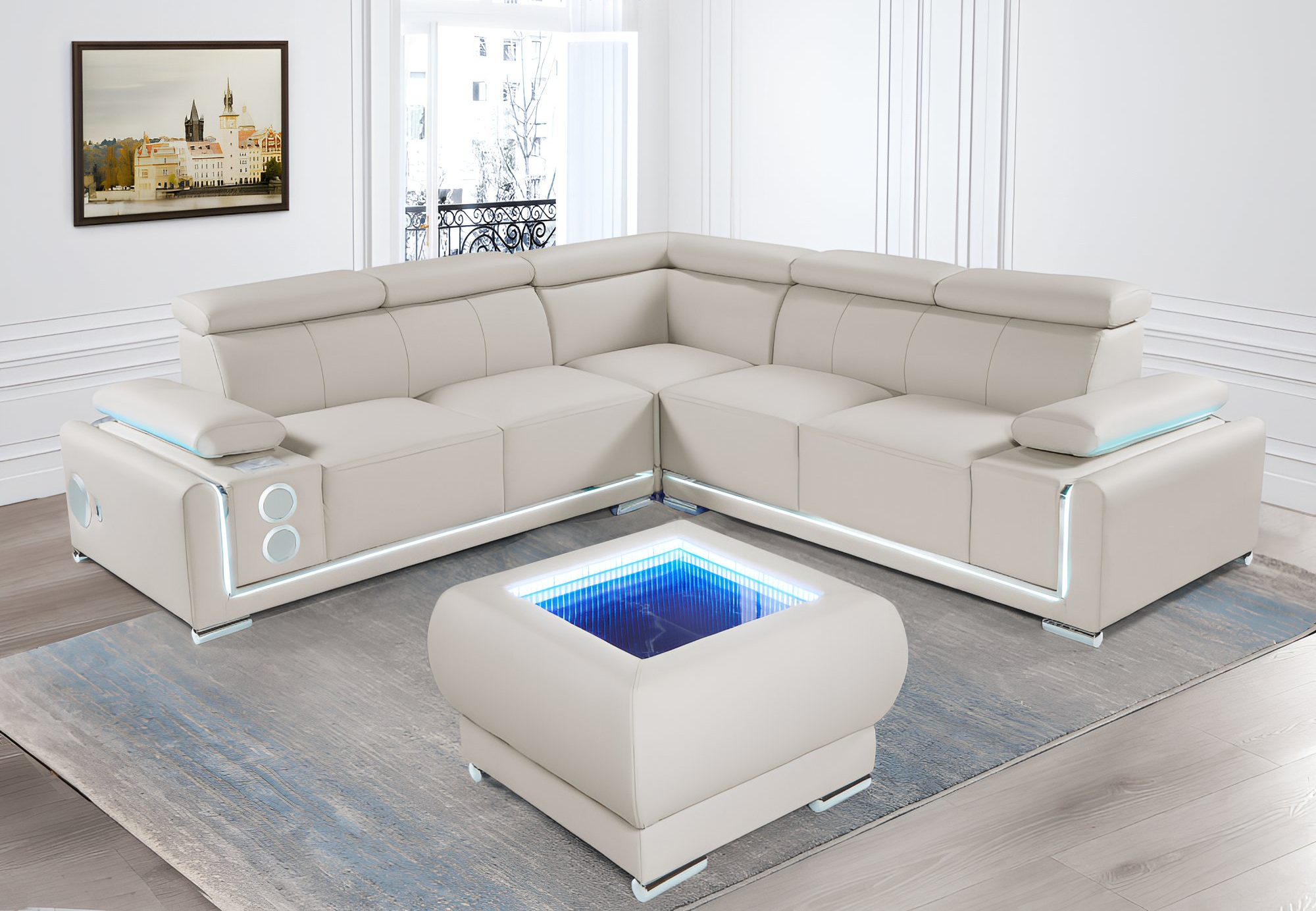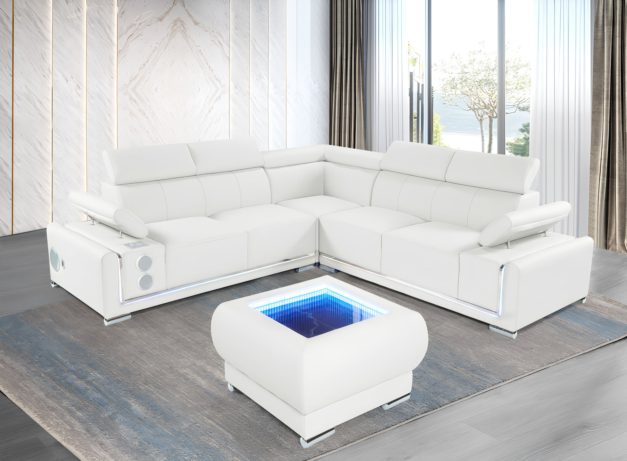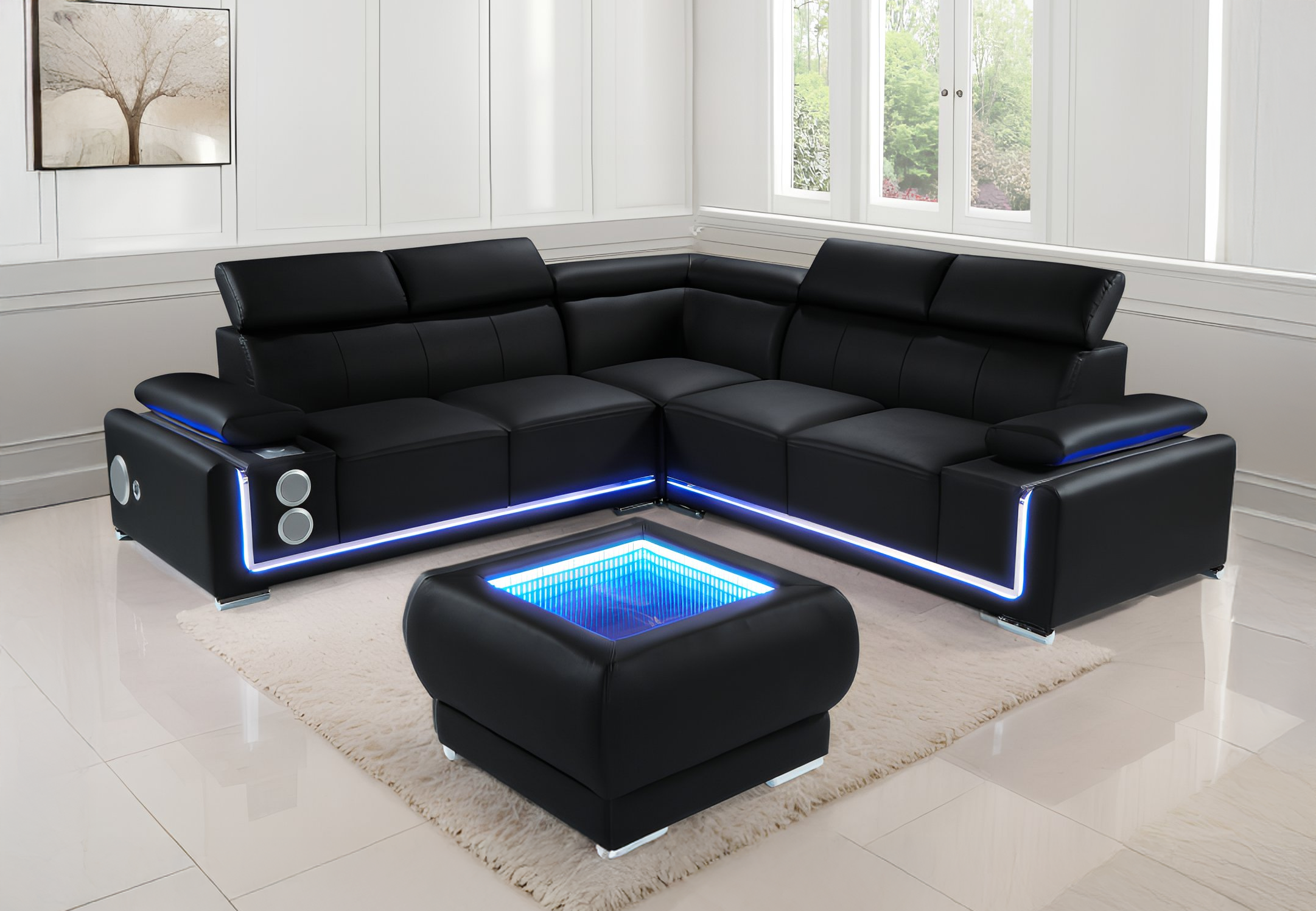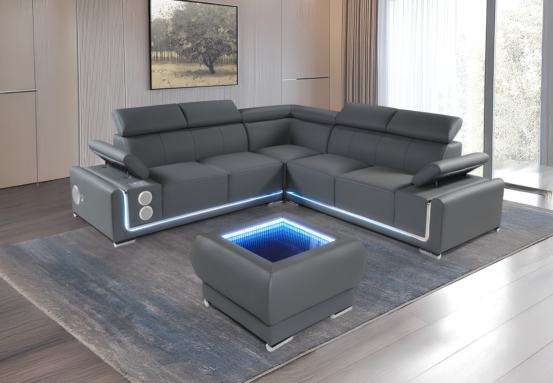 Modern L-shaped sectional sofa with built-in LED lighting, adjustable headrests, integrated speakers, and a matching ottoman featuring an infinity mirror table design.