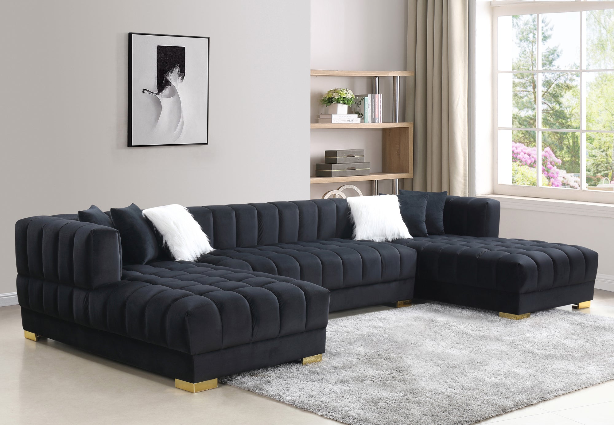 Plush and modern, this black corduroy sectional offers deep seating, clean lines, and a matching ottoman—perfect for lounging in style and comfort.