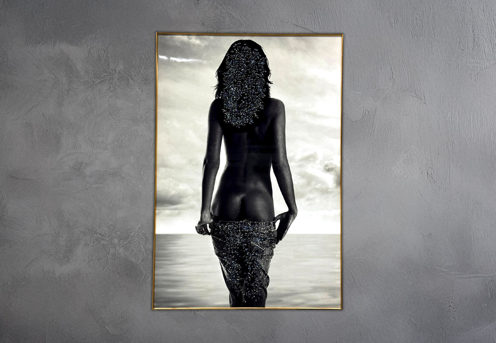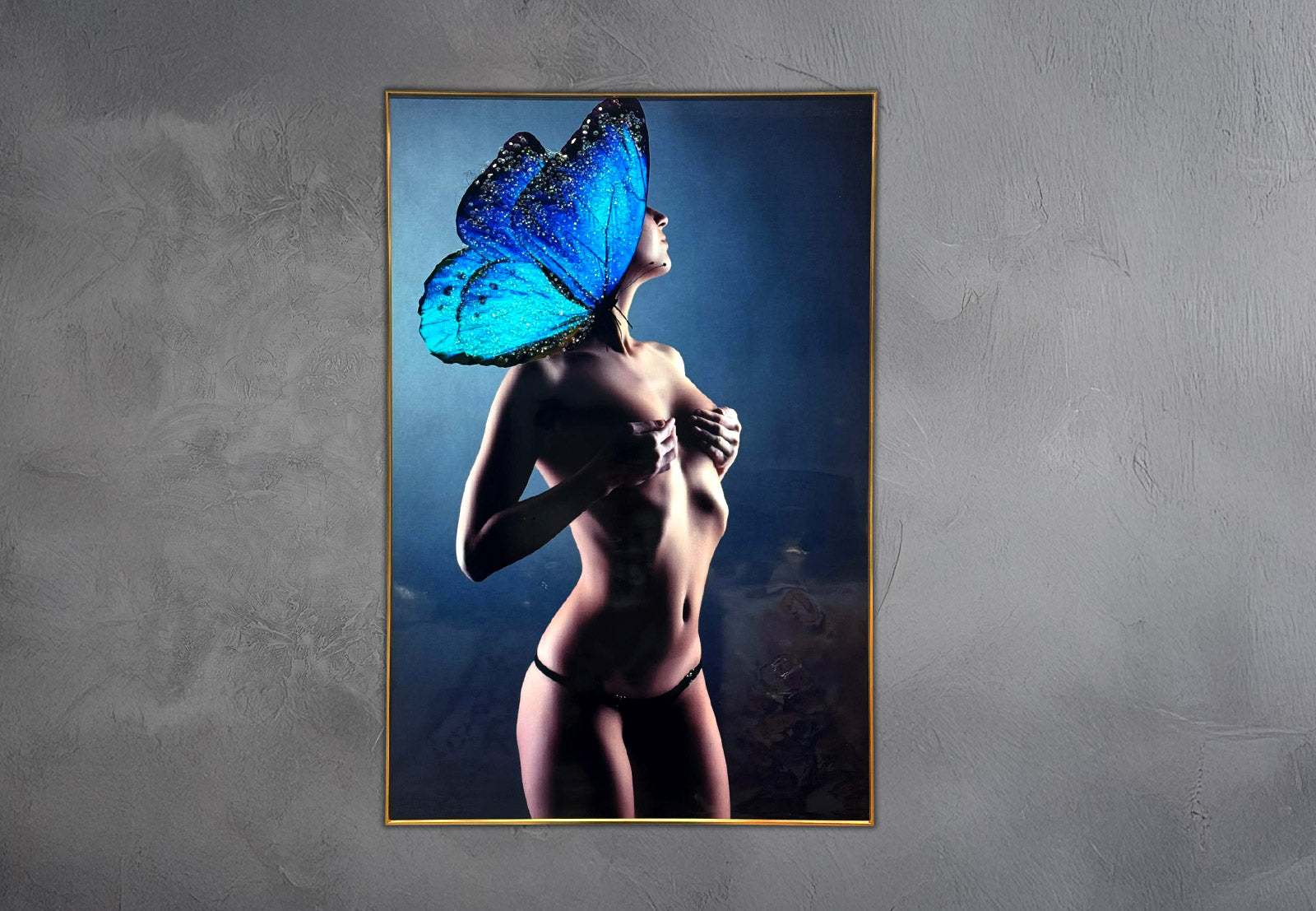 A surreal and artistic depiction of transformation, featuring a nude figure with a vibrant blue butterfly in place of their head, symbolizing rebirth and evolution. Size:...