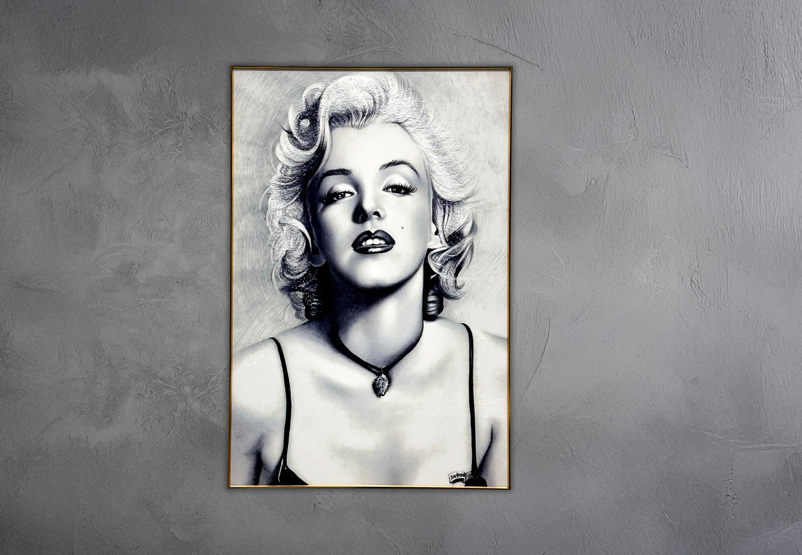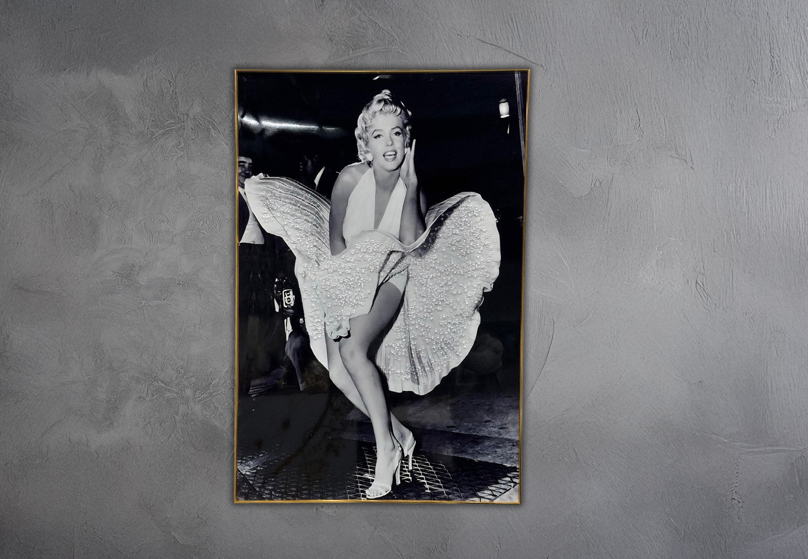 A classic black and white framed artwork of Marilyn Monroe in her iconic pose, adding vintage Hollywood glamour to any interior.