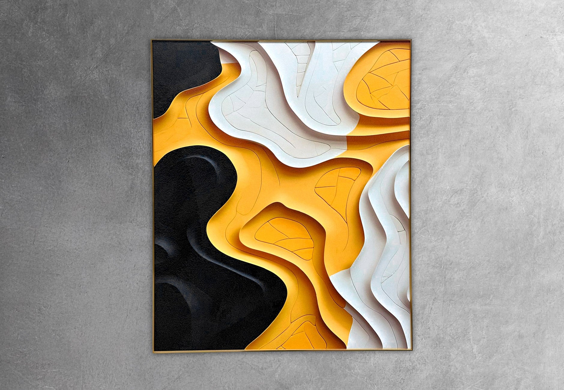 A contemporary, abstract wall art piece featuring fluid golden, black, and white layers, creating a three-dimensional effect perfect for modern interiors.