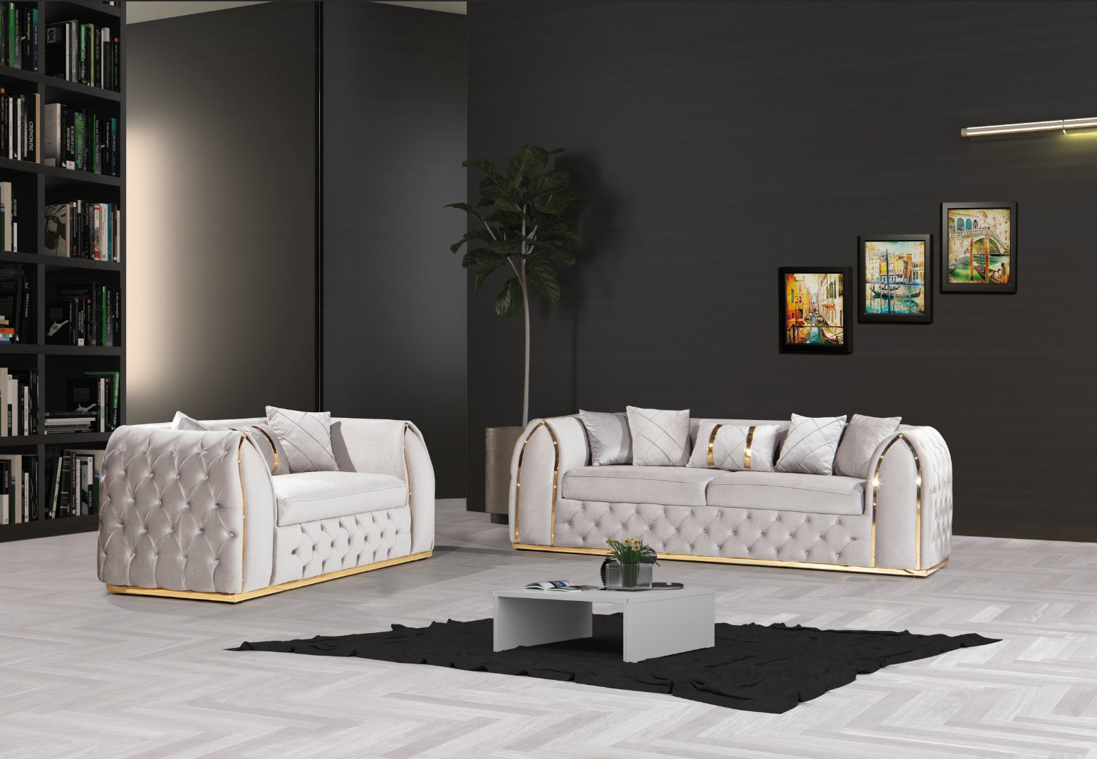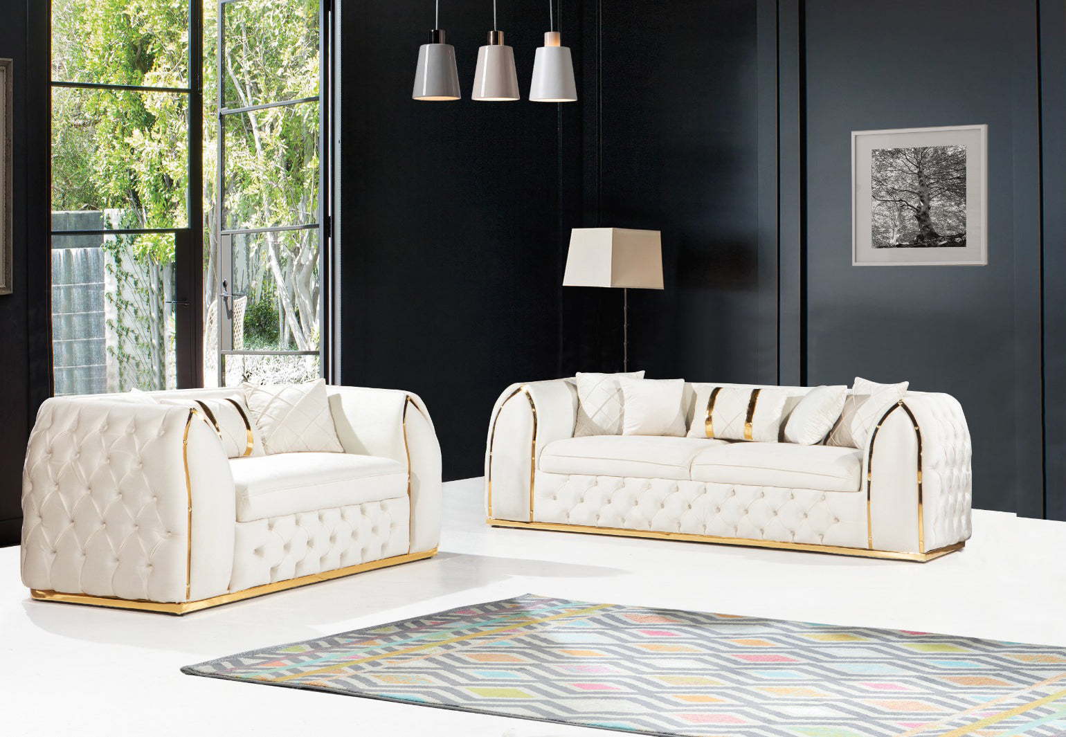 This luxurious living room set brings together elegance and modern design with its tufted white upholstery and sleek silhouette. The sofas feature gently curved arms adorned with gold accents, creating a striking visual contrast that enhances the overall sophistication of the pieces. The plush cushions, paired with detailed stitching, add both comfort and style. Perfect for a bold yet refined ambiance, this set elevates any space with its contemporary glamour and timeless appeal. Ideal for modern interiors looking for a touch of opulence.