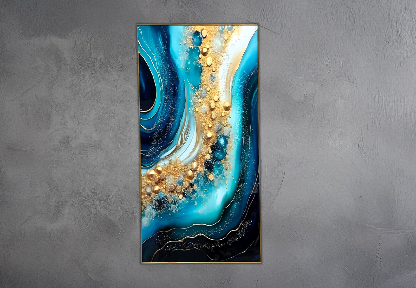 A mesmerizing abstract piece blending deep blues and shimmering gold, evoking the beauty of ocean currents and celestial energy.