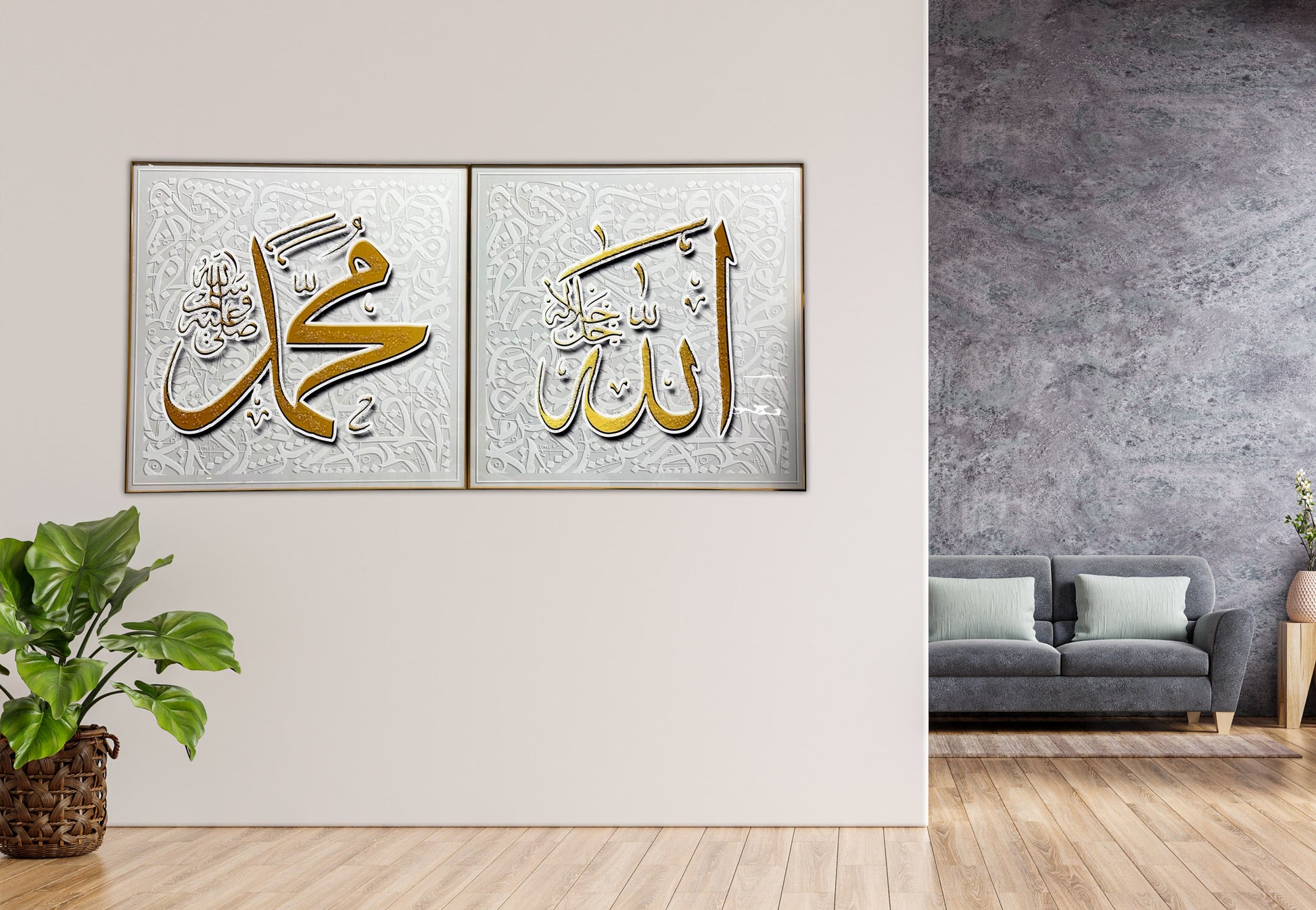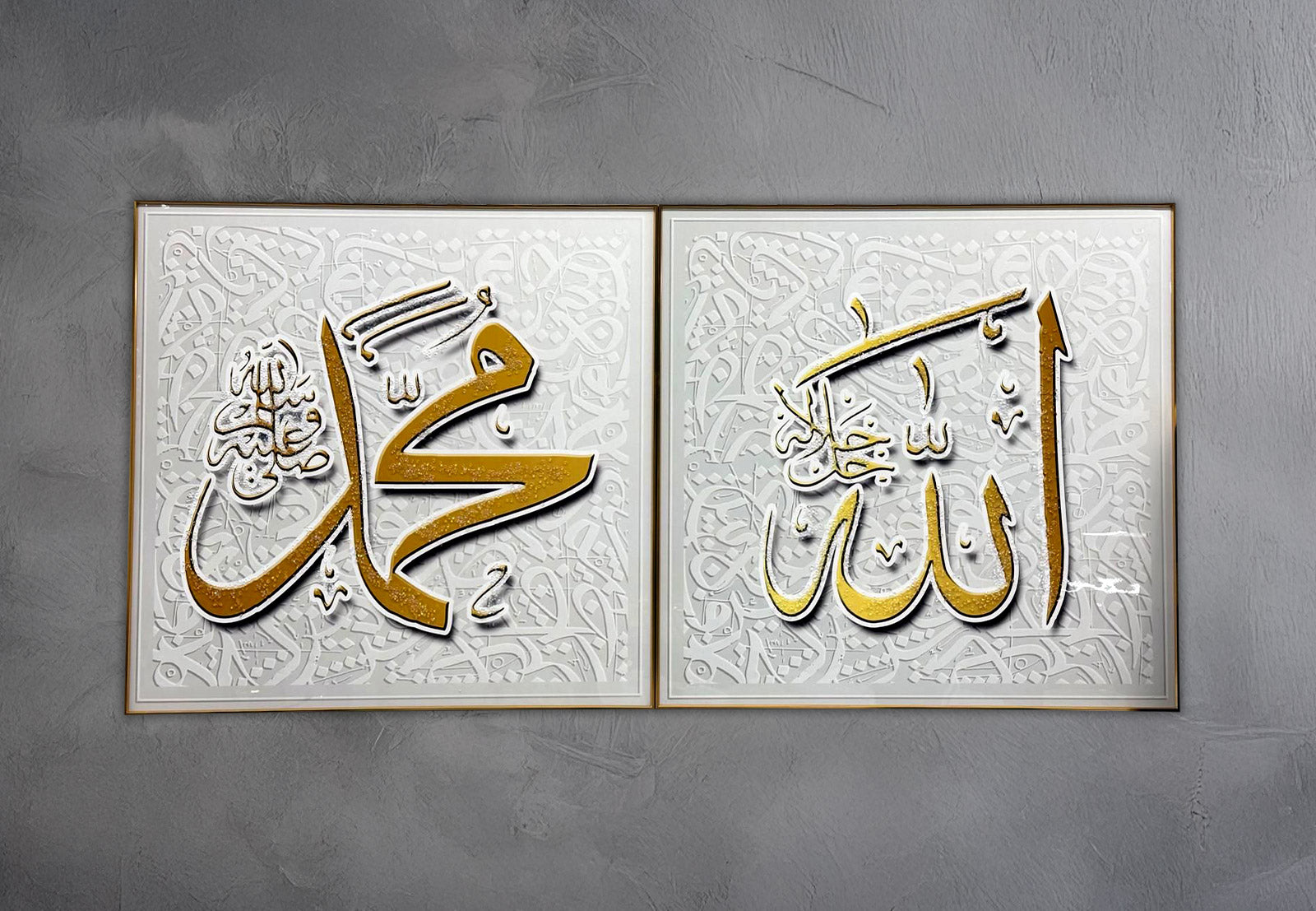 An elegant Arabic calligraphy diptych with gold and white detailing, symbolizing faith and peace in a refined aesthetic.