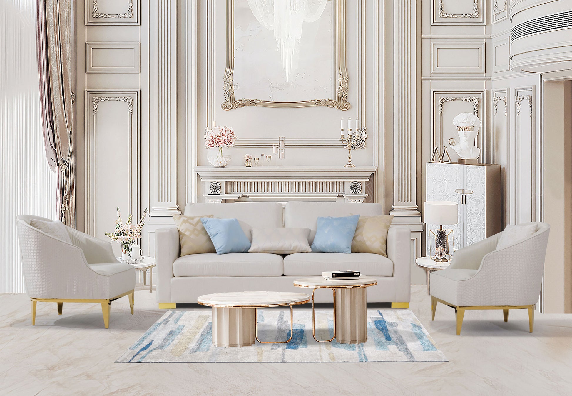 This elegant living room set is a perfect blend of classic charm and modern sophistication. The centerpiece sofa is upholstered in soft beige fabric, complemented by gently curved armchairs that add a refined touch to the arrangement. Subtle gold accents on the legs and trim elevate the aesthetic, while the plush cushions in muted pastel tones enhance comfort and style. Paired with unique coffee tables featuring rounded designs and metallic finishes, this set creates a warm yet luxurious ambiance, ideal for upscale interiors with a timeless appeal.