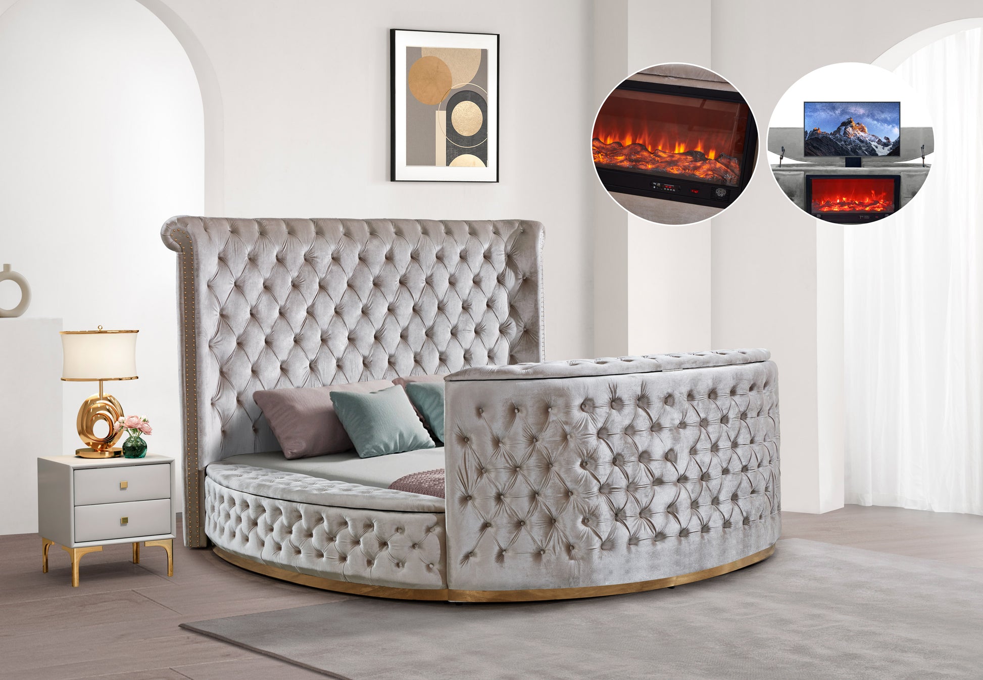 Redefine luxury with this black velvet tufted round bed, combining modern design with exceptional functionality. The grand tufted headboard and curved footboard are accented with nailhead trim for added sophistication. A striking gold-tone base completes the design, exuding a sense of opulence. Equipped with built-in features, including an electric fireplace for warmth and ambiance and a hidden TV lift for entertainment, this bed takes comfort and convenience to the next level. Perfect for creating a cozy and elegant retreat.