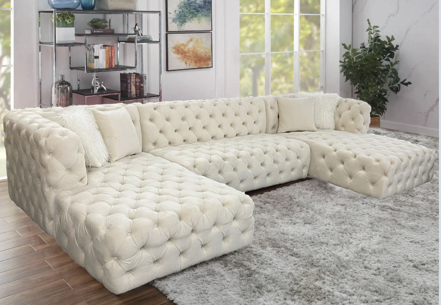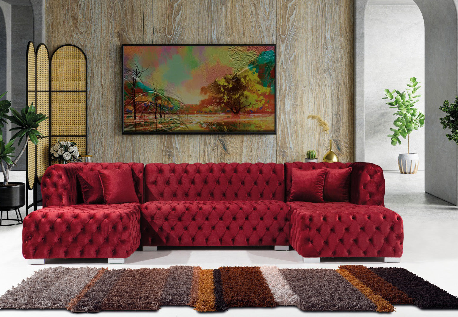 Add a bold and luxurious statement to your living room with this stunning tufted red velvet sectional sofa. Its deep button tufting and plush upholstery exude timeless elegance, while the spacious L-shaped design offers maximum comfort for lounging or entertaining. Complemented by sleek chrome legs, this sofa blends modern glamour with classic sophistication.