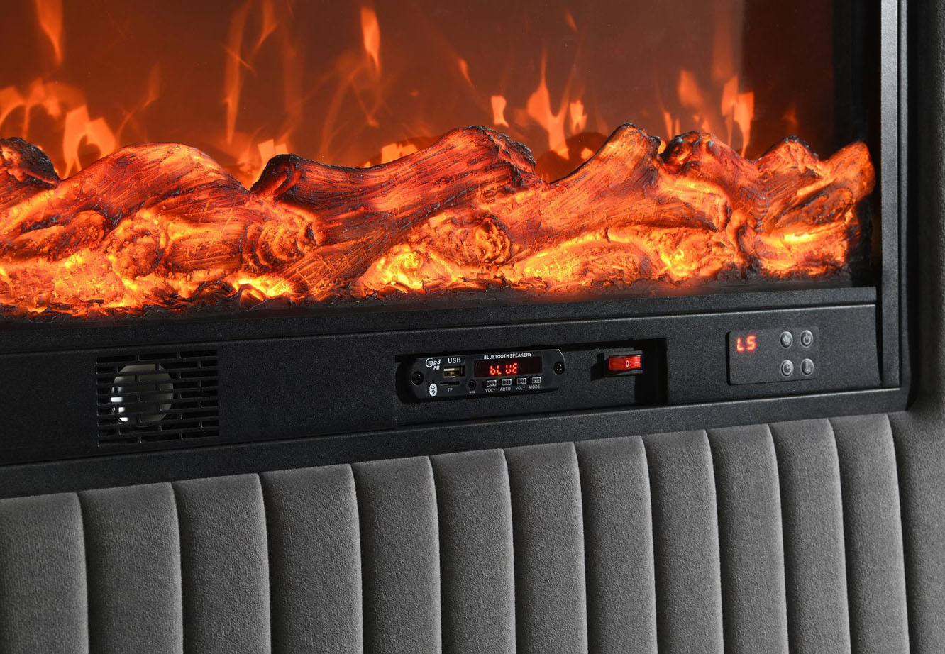 Modern elegance meets innovative functionality in this sleek black upholstered bed. The bold, ribbed design of the headboard features an integrated electric fireplace, adding warmth and ambiance to your space. Gold accents on the headboard and base provide a glamorous touch, while the low-profile frame ensures a contemporary look. Ideal for anyone seeking comfort, style, and sophistication, this bed redefines luxury living.