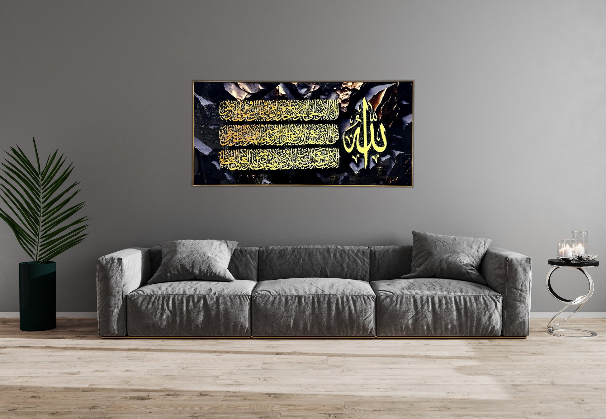 A sophisticated Islamic calligraphy artwork with golden Arabic script on a dark textured background, radiating spirituality and artistic depth.
