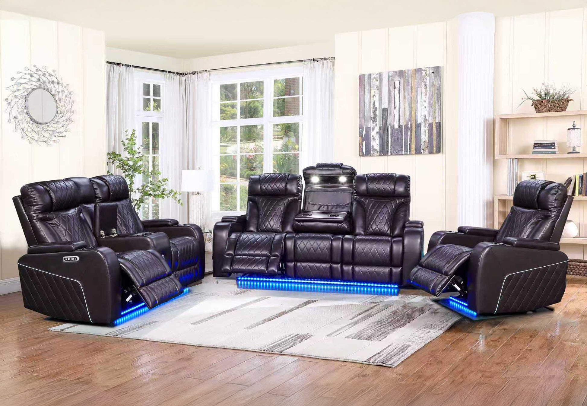 Luxurious dual reclining theater sofas in black diamond-stitched leather, featuring LED base lighting, built-in cup holders, and power controls — perfect for a modern home entertainment setup.