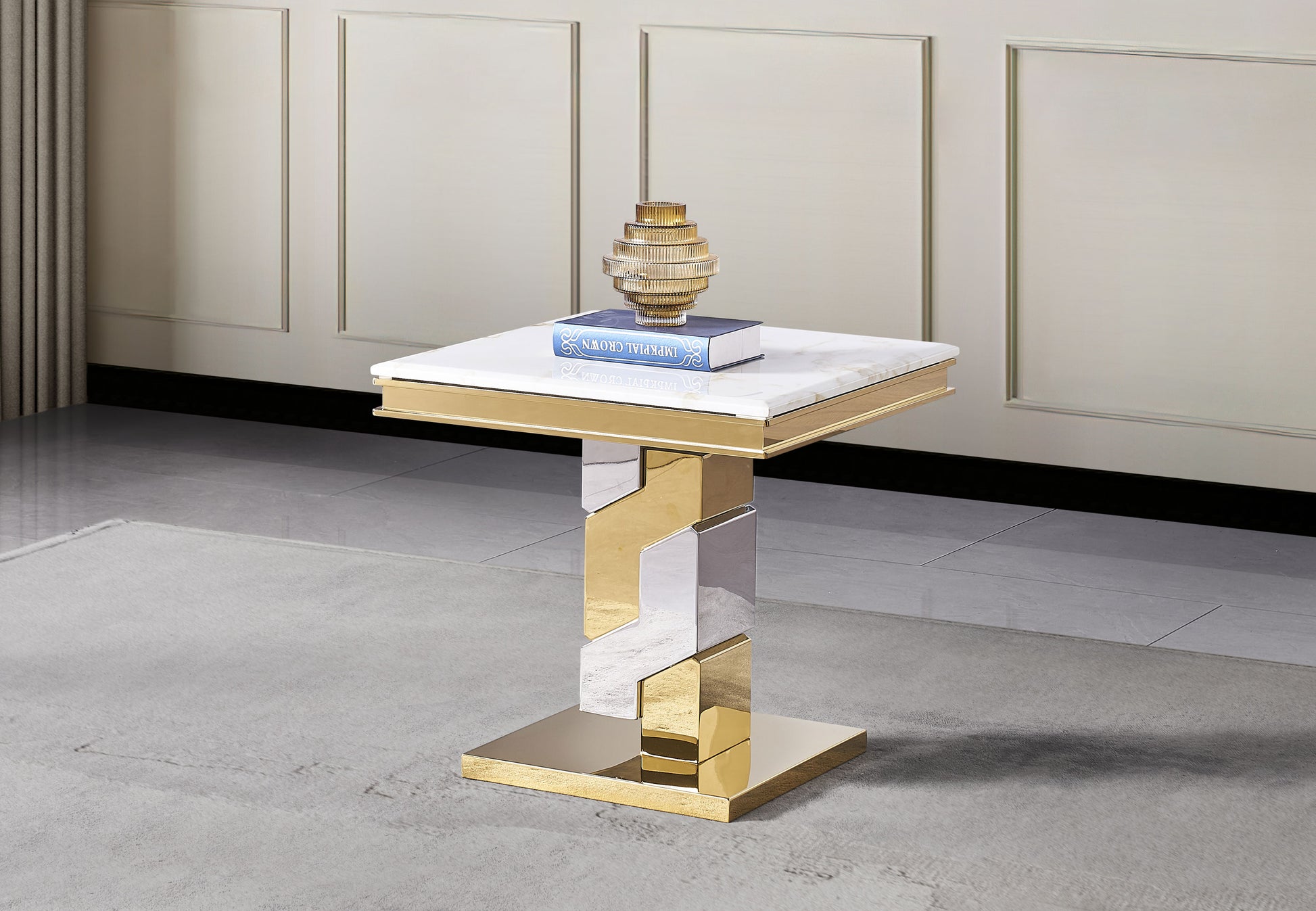 A luxurious, modern side table with a square white marble top and a striking geometric base combining polished gold and chrome finishes. The base features an angular, stacked design, providing a sense of elegance and sophistication. The table is placed in a minimalist interior with muted beige panel walls, a soft gray rug, and a glossy tiled floor. On the tabletop, there’s a decorative golden lamp with a sculptural, layered design resting on a stylish blue book, adding to the overall opulence and contemporary aesthetic