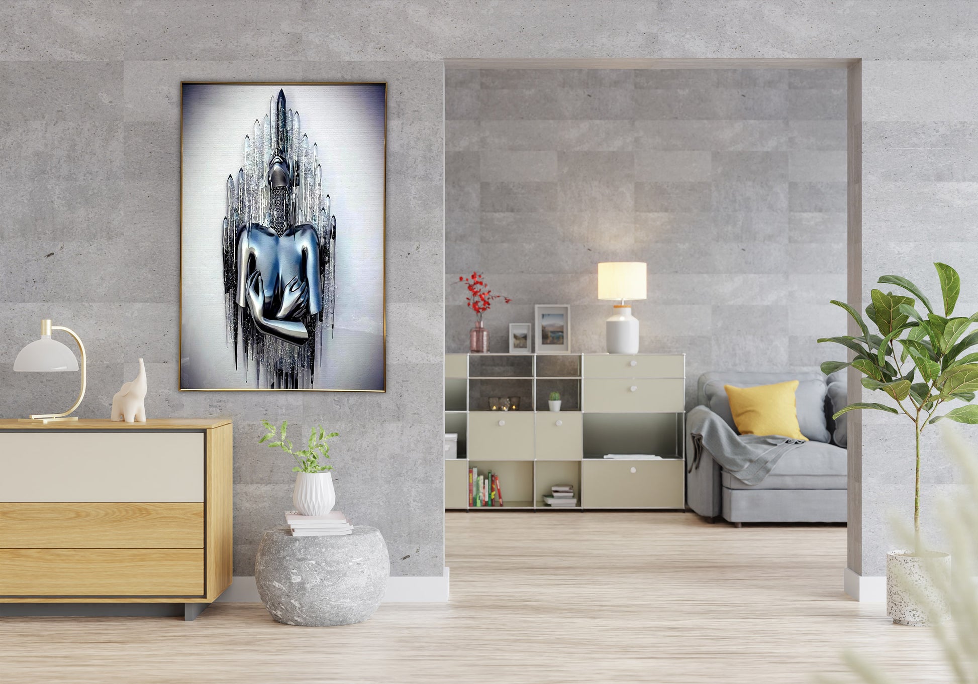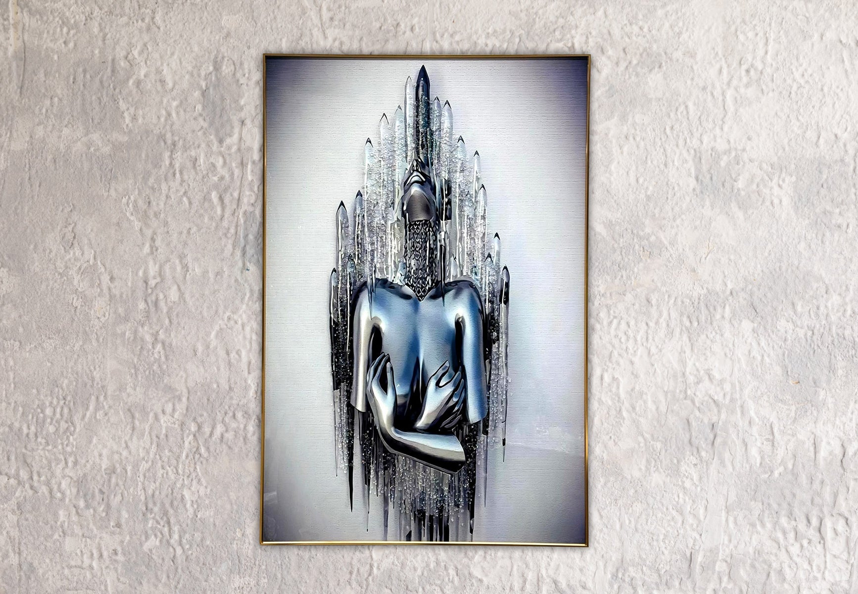 A mesmerizing metallic sculpture of a figure encased in icy crystal formations, symbolizing strength and serenity.