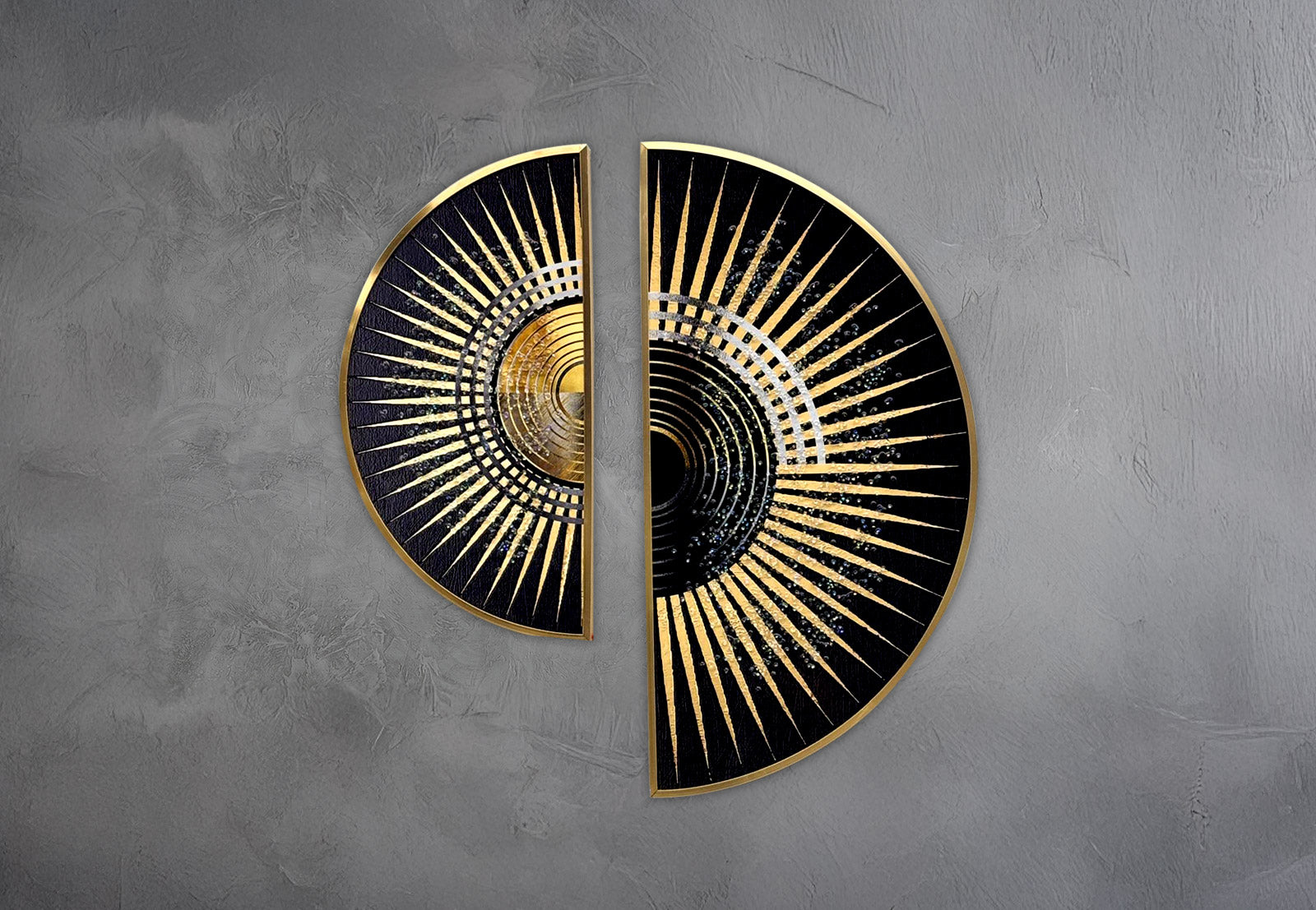 A mesmerizing geometric artwork with radiant golden rays against a deep black backdrop, symbolizing strength, energy, and precision.