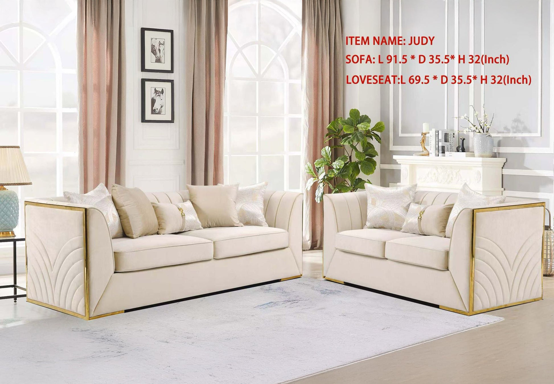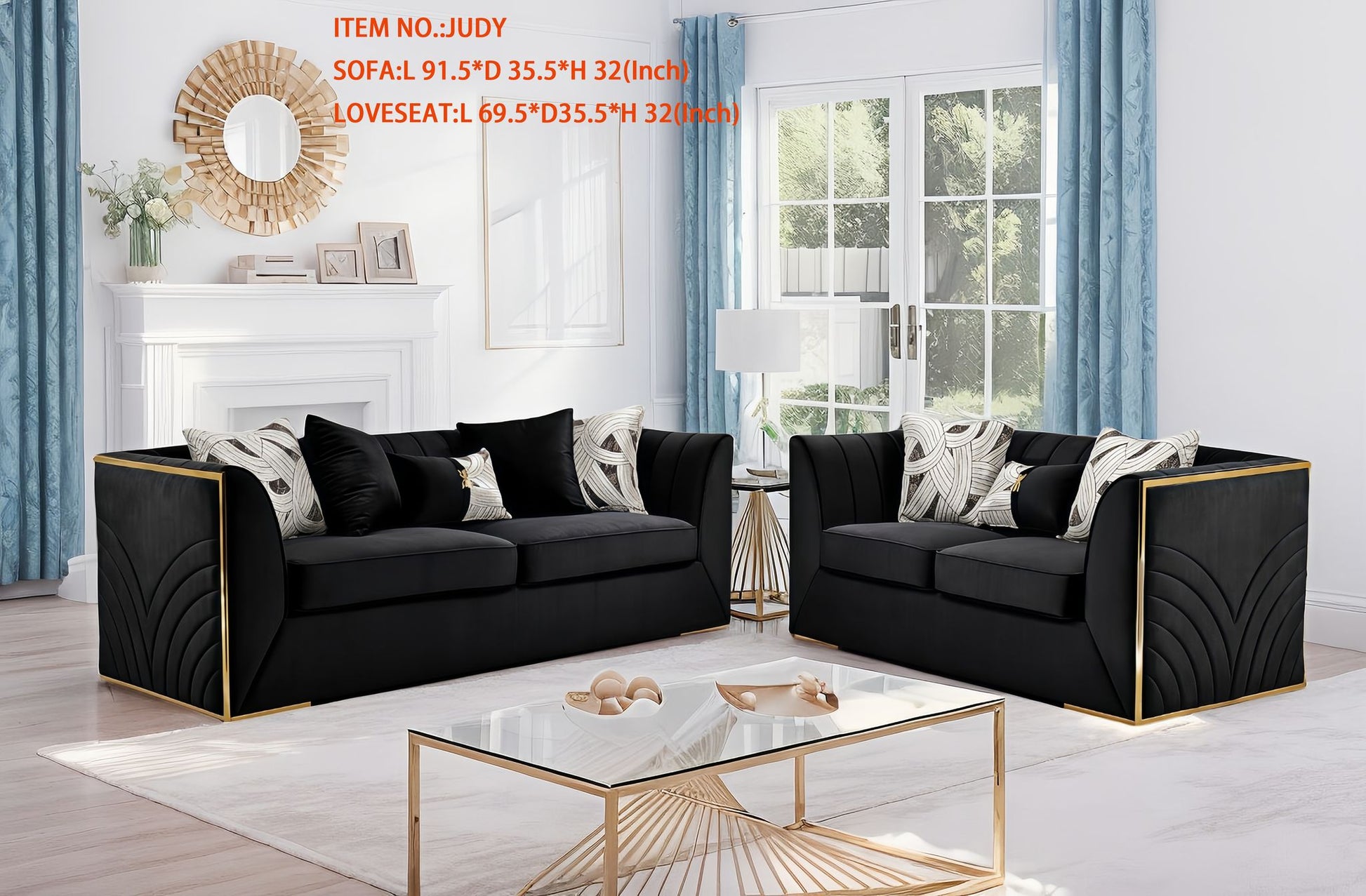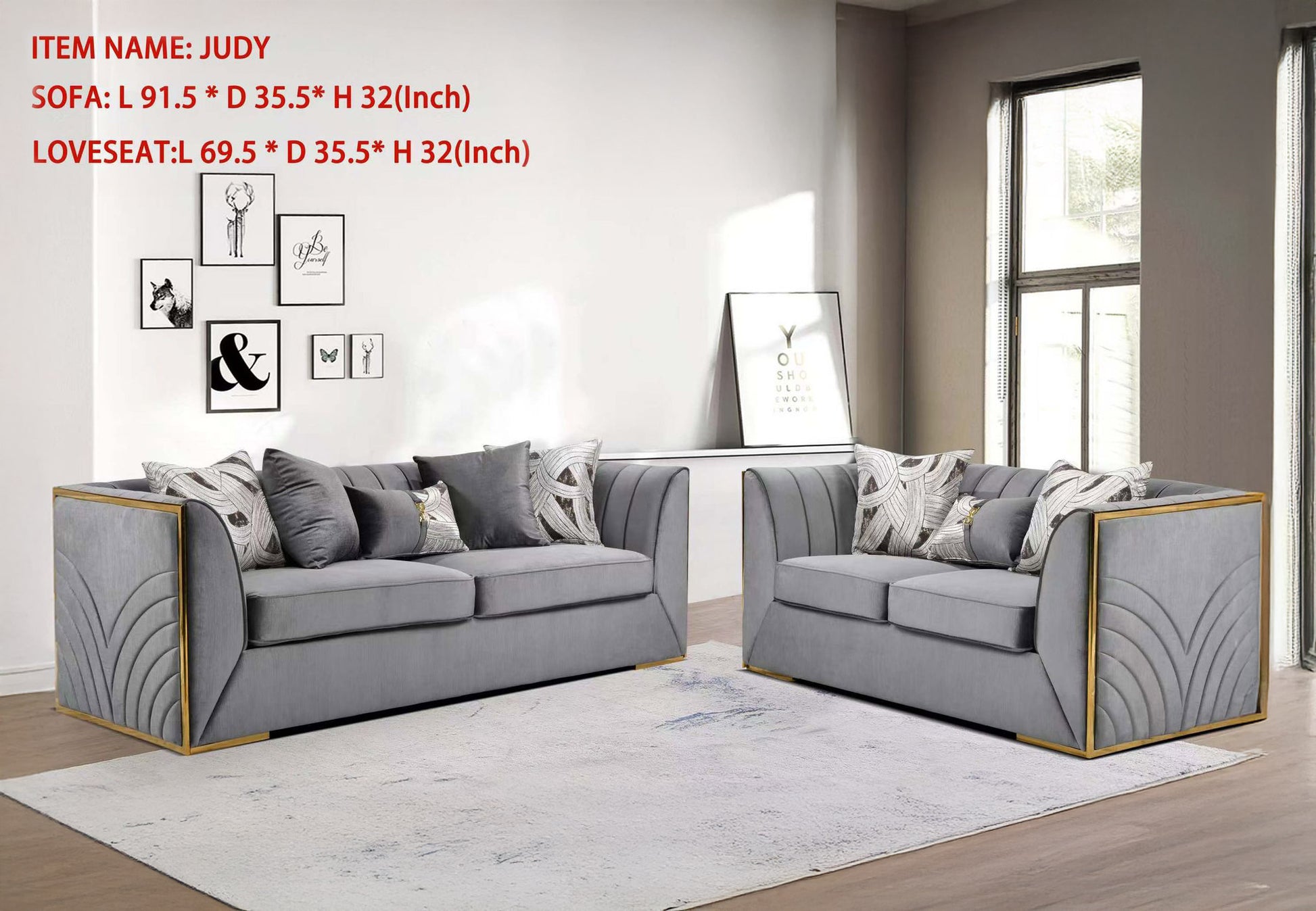 Chic and elegant, the Judy sofa set features soft grey velvet with art deco-inspired channel tufting and gold trim accents. Perfect for modern spaces seeking a stylish upgrade with a touch of glam.