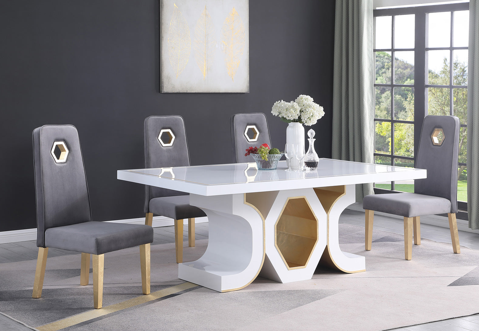 Introduce contemporary sophistication to your dining room with this sleek white and gold dining set. Perfect for modern interiors, this table boasts a striking geometric base and pairs seamlessly with bold black chairs accented by gold details.