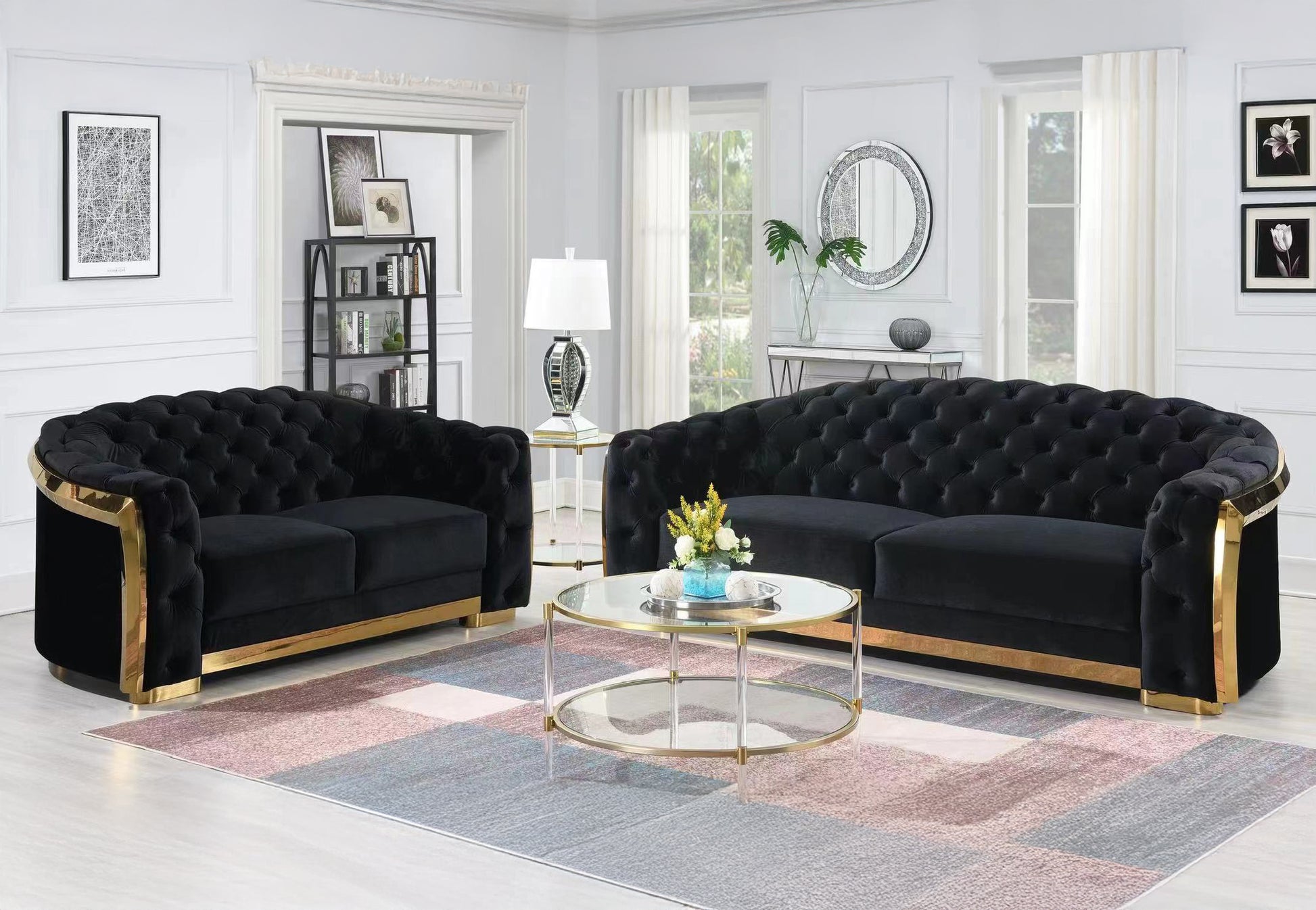 This luxurious living room set exudes bold sophistication with its rich black velvet upholstery and exquisite tufted design. The curved silhouette of each piece adds a touch of elegance, while the gleaming gold accents along the base and armrests bring a striking, modern contrast. Designed for both comfort and style, this set transforms any space into a high-end retreat. Paired with a sleek glass coffee table, it is perfect for creating a glamorous and inviting living area that makes a statement.