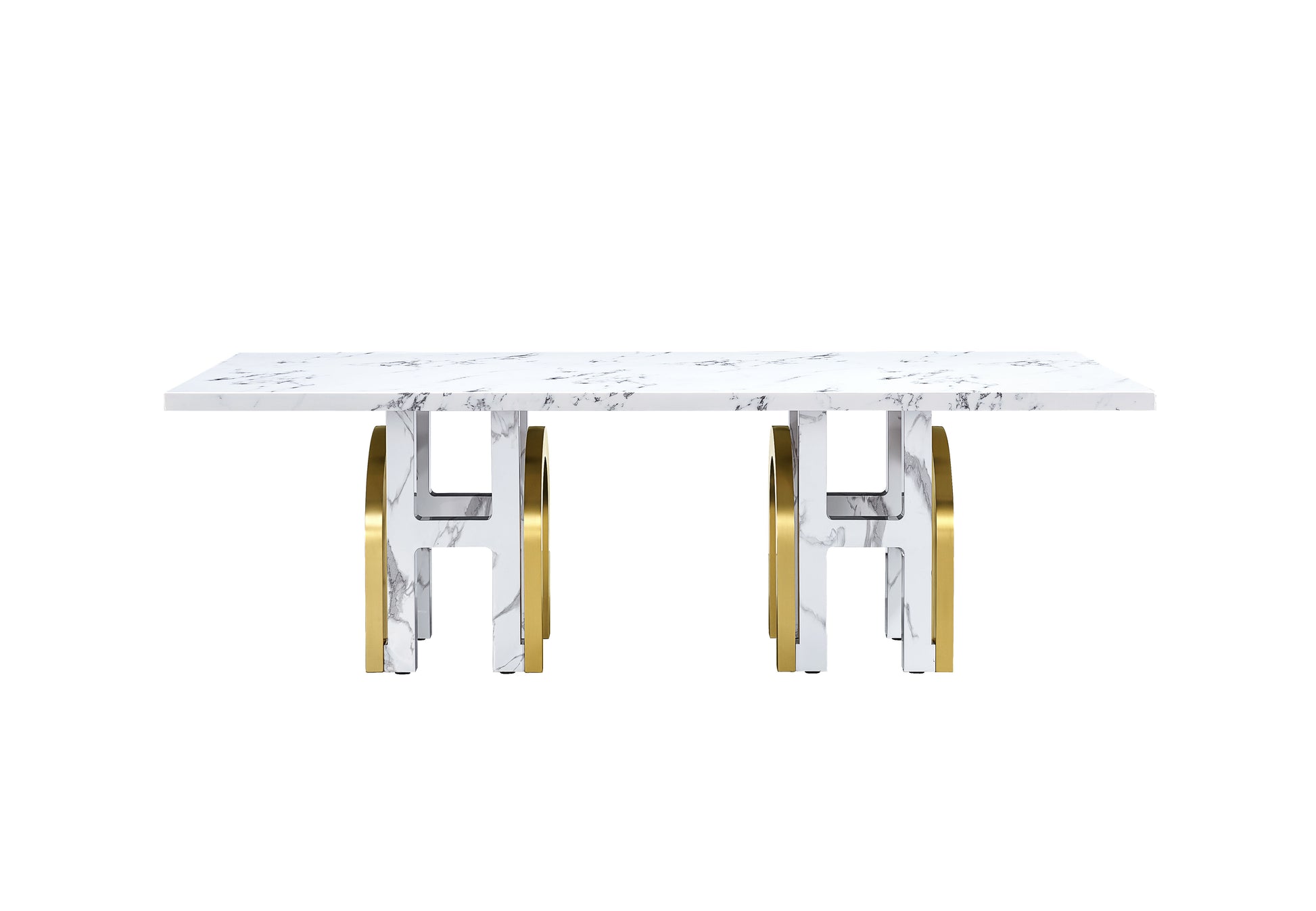 A luxurious rectangular table with a sleek white marble top featuring subtle gray veining. The bold base showcases a geometric marble design with elegant gold metal arches, adding a touch of sophistication. Perfect for modern, upscale interiors.