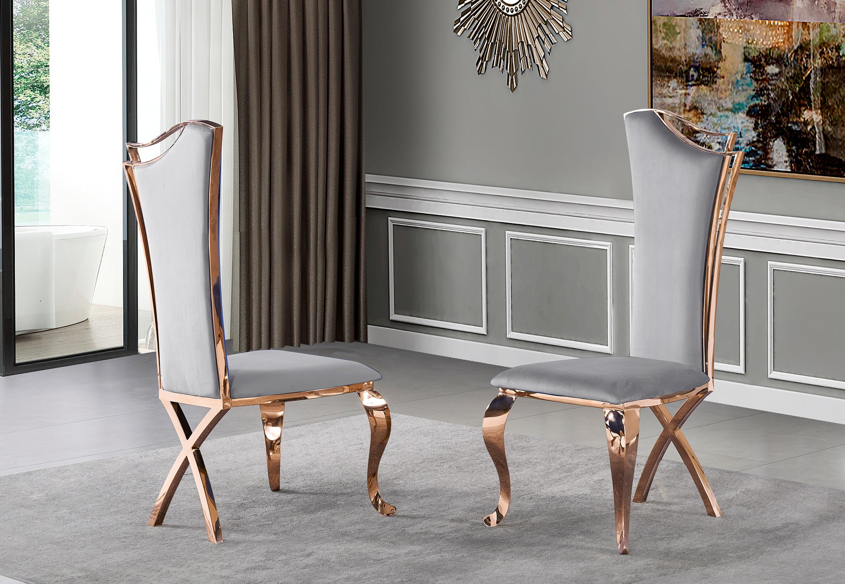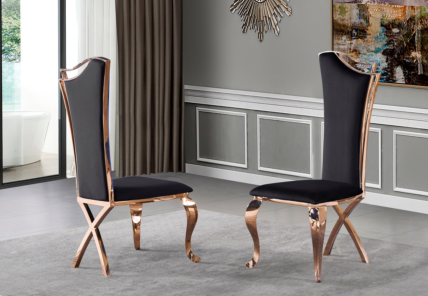 Add a touch of opulence to any space with these high-back dining chairs featuring sleek black velvet upholstery and striking rose gold stainless steel frames. Designed to impress, these chairs combine luxurious aesthetics with durability, perfect for upscale commercial and hospitality settings.