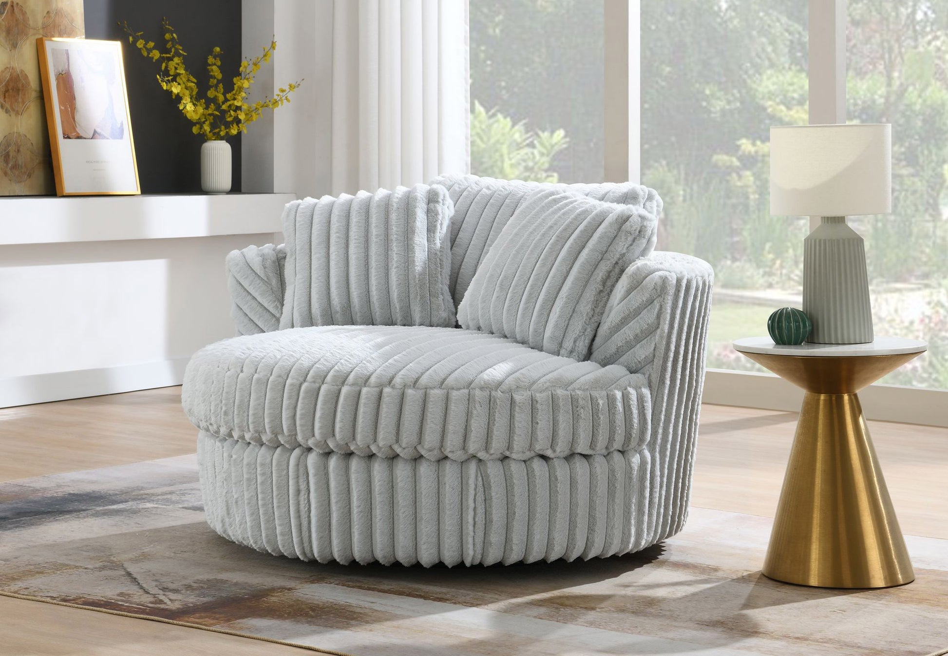 Wrapped in plush ribbed velvet, the Cloud Luxe Swivel Chair offers deep seating, cozy comfort, and a bold rounded shape that adds a modern statement to any space.